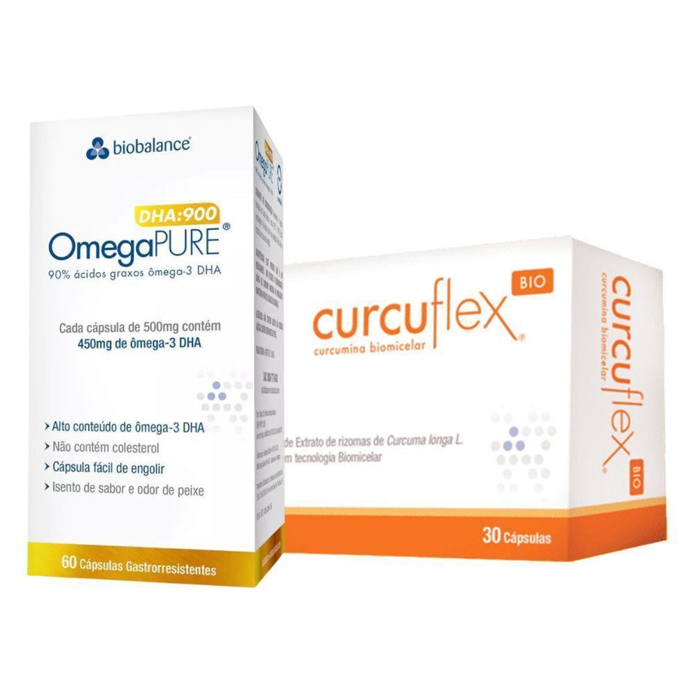Omegapure DHA 900 500mg 60 cápsulasA maior concentração de Ômega-3- DHA na menor cápsula OmegaPURE DHA900® é indicado para quem deseja obter o máximo dos benefícios dos ácidos graxos ômega-3 com o conforto da gastro-resistência e ZERO Colesterol. Todos os benefícios em uma cápsula pequena, fácil de engolir, sem odor ou sabor, pronta para ser ingerida a qualquer momento do dia.Curcuflex 30 cápsulas 920mgCurcuflex-BIO® é um suplemento alimentar com curcumina de alta absorção. A recomendação para adultos é de 1 a 2 cápsulas diárias ou conforme indicação do profissional da saúde.Entendendo o aproveitamento da curcuminaUtilizada na medicina tradicional, a Curcumina auxilia na redução das dores articulares2,como mediador da resposta anti-inflamatória3,4e,na proteção das cartilagens e manutenção da flexibilidade5.Curcuflex- Bio apresenta uma ação pleiotrófica, modulandomúltiplasvias da sinalização celular e afetando vários alvos moleculares diferentes. Essas atividades estão relacionadas à sua estrutura molecular e características químicas, assim comoàsua capacidade de interagir e regular vários componentes de sinalização celular, de maneira direta ou indireta, tais como fatores de transcrição, enzimas, mediadores inflamatórios, proteínas quinases, moléculas de adesão, fatores de crescimento, quimiocinas, proteínas transportadoras, íons metálicos, DNA(deoxyribonucleic acid), RNA(ribonucleic acid)entre outros.A curcumina, presente na cúrcuma natural e no seu extrato purificado, apresenta baixa absorção, correspondendo a apenas 1% de aproveitamento após a ingestão. 4,5Elaborado com tecnologia Biomicelar exclusiva, CURCUFLEX®-BIO , apresenta maior biodisponibilidade quando comparado comparada às outras formas de curcumina¹.Sugestão de UsoAdministrar por via oral com um pouco de água. A dose habitual para adultos é de 1 a 2 cápsulas diárias ou conforme indicação do médico ou nutricionista.