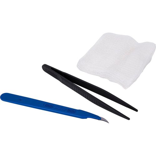 Kit retirada de pontos descartável para realização de remoção de pontos cirúrgicos estéril. Kit composto por: 1 pinça retirada de pontos, fabricada em resina de engenharia, com 146 mm de comprimento, com dentes de 3mm sobrepostos em sua porção distal; 1 lâmina de bisturi com cabo nº 12. 5 compressas de gaze de 11 fios, com dimensões de 7,5 cm x 7,5 cm dobrada;
