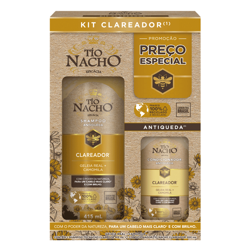 O Kit Tio Nacho Clareador Antiqueda Shampoo + Condicionador contém produtos com fórmula enriquecida por camomila e geléia real, que nutrem, fortalecem e clareiam gradativamente os fios, deixando os cabelos mais macios, suaves e brilhantes. Indicado para cabelos claros ou com mechas.