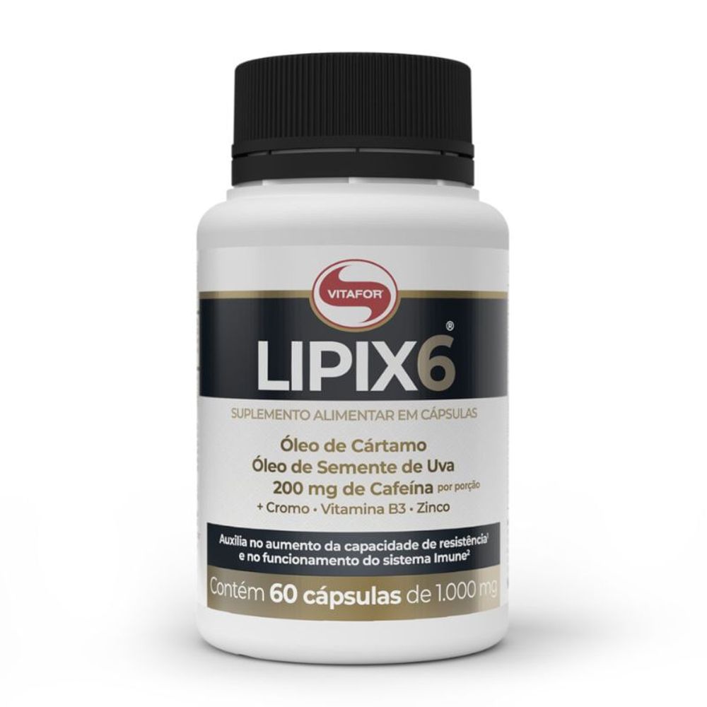 O Lipix 6 da marca Vitafor é um suplemento composto por 200mg de cafeína, óleo de cártamo, óleo de semente de uva, vitaminas e minerais. Em uma fórmula sem açúcar e sem glúten. Vem em embalagem com 60 cápsulas gelatinosas.