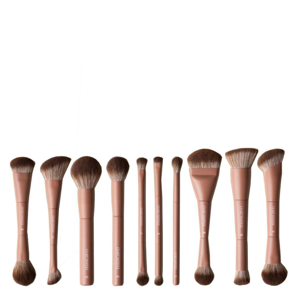 Kit Mascavo Brush Pro Series All Set Pincéis Profissionais, Alta Performance e Acabamento PerfeitoKit de pincéis profissionais para maquiagem completa. O Kit Mascavo Brush Pro Series All Set reúne 10 pincéis de alta performance desenvolvidos para garantir acabamento impecável em todas as etapas da maquiagem, do preparo da pele aos detalhes dos olhos. Criado para atender tanto maquiadores profissionais quanto apaixonados por maquiagem, este kit entrega precisão, versatilidade e resultado de nível editorial.Com design multifuncional e cerdas sintéticas ultramacias, cada pincel oferece controle absoluto do produto, toque suave na pele e aplicação uniforme. A linha Pro Series foi pensada para maximizar performance, reduzir marcas de aplicação e proporcionar acabamento natural, polido e profissional.O Kit Mascavo Brush Pro Series All Set é ideal para quem busca um Kit completo, funcional e sofisticado, que permite realizar desde produções leves do dia a dia até looks complexos e altamente elaborados.Benefícios do Kit Mascavo Pro Series All SetKit completo com 10 pincéis profissionais para rosto, olhos e acabamentoCerdas sintéticas ultramacias: suavidade, precisão e aplicação uniformeVersatilidade máxima: ideal para produtos líquidos, cremosos e em póPincéis multifuncionais que atendem desde iniciantes até maquiadoresDesign ergonômico que garante conforto e controle durante a aplicaçãoAcabamento polido, natural e de alta definiçãoIdeal tanto para uso pessoal quanto profissionalTecnologiaCerdas Sintéticas UltraSoft™ – Fibras avançadas que proporcionam maciez extrema, alta durabilidade e aplicação uniforme sem riscar ou marcar a pele.Design Ergoflex – Cabos leves e ergonômicos projetados para facilitar movimentos precisos, garantindo melhor performance em todas as técnicas de maquiagem.Arquitetura Multifuncional de Cerdas – Cada pincel possui corte e densidade específicos para otimizar o uso com diferentes tipos de produtos e acabamentos.Pincéis Inclusos no Kit Mascavo Brush Pro Series All SetPro Series 01 – Pincel Duplo para Rosto: ideal para aplicação de base, pó compacto ou solto; perfeito para polimento e uniformização.Pro Series 02 – Pincel Duplo Angular: ideal para contorno, bronzer e blush; proporciona acabamento esfumado e natural.Pro Series 03 – Pincel para Pó: garante aplicação leve e homogênea, oferecendo cobertura natural e confortável.Pro Series 04 – Pincel para Acabamento e Retoque: indicado para blush, iluminador e retoques direcionados; acabamento sofisticado.Pro Series 05 – Pincel Duplo para Sombra: perfeito para aplicar e esfumar sombras com precisão, entregando um olhar definido e profissional.Pro Series 06 – Pincel Duplo para Detalhes: ideal para iluminar pontos estratégicos, esfumar detalhes e trabalhar cantos menores dos olhos.Pro Series 07 – Pincel para Esfumar: cria transições suaves entre as sombras, garantindo esfumado perfeito e sem marcações.Pro Series 08 – Pincel Duplo Full Face: multifuncional para base, corretivo, contorno e polimento; ideal para técnicas rápidas e acabamentos precisos.Pro Series 09 – Pincel Duplo para Base e Corretivo: oferece cobertura uniforme, sem riscos e sem acúmulo; ideal para técnica de batidinhas e correção pontual.Pro Series 10 – Pincel Duplo para Produtos Cremosos e em Pó: aplicação fluida e controle absoluto; perfeito para multitexturas.Como Usar o Kit Mascavo Brush Pro Series All SetAplique a base com o Pincel Pro Series 01 ou 09, usando movimentos de batidinhas para cobertura uniforme.Modele o rosto com o Pincel Angular Pro Series 02 para contorno, blush ou bronzer.Sele a make com o Pincel Pro Series 03 para aplicar pó suavemente.Finalize o acabamento com o Pincel Pro Series 04 aplicando iluminador ou blush com leveza.Aplique e esfume sombras com o Pincel Pro Series 05 e o Pro Series 07 para esfumar.Realce detalhes com o Pincel Pro Series 06 para pontos de luz e áreas menores.Use o Pincel Pro Series 08 para finalizar, polir a pele e integrar todos os produtos para um acabamento profissional.Como Limpar os Pincéis Mascavo Pro SeriesLave as cerdas regularmente com água corrente e sabão neutro até remover completamente os resíduos de maquiagem. Aperte suavemente para retirar o excesso de água e deixe secar naturalmente em local arejado, sempre na posição horizontal. Não utilize álcool isopropílico para higienização dos pincéis.