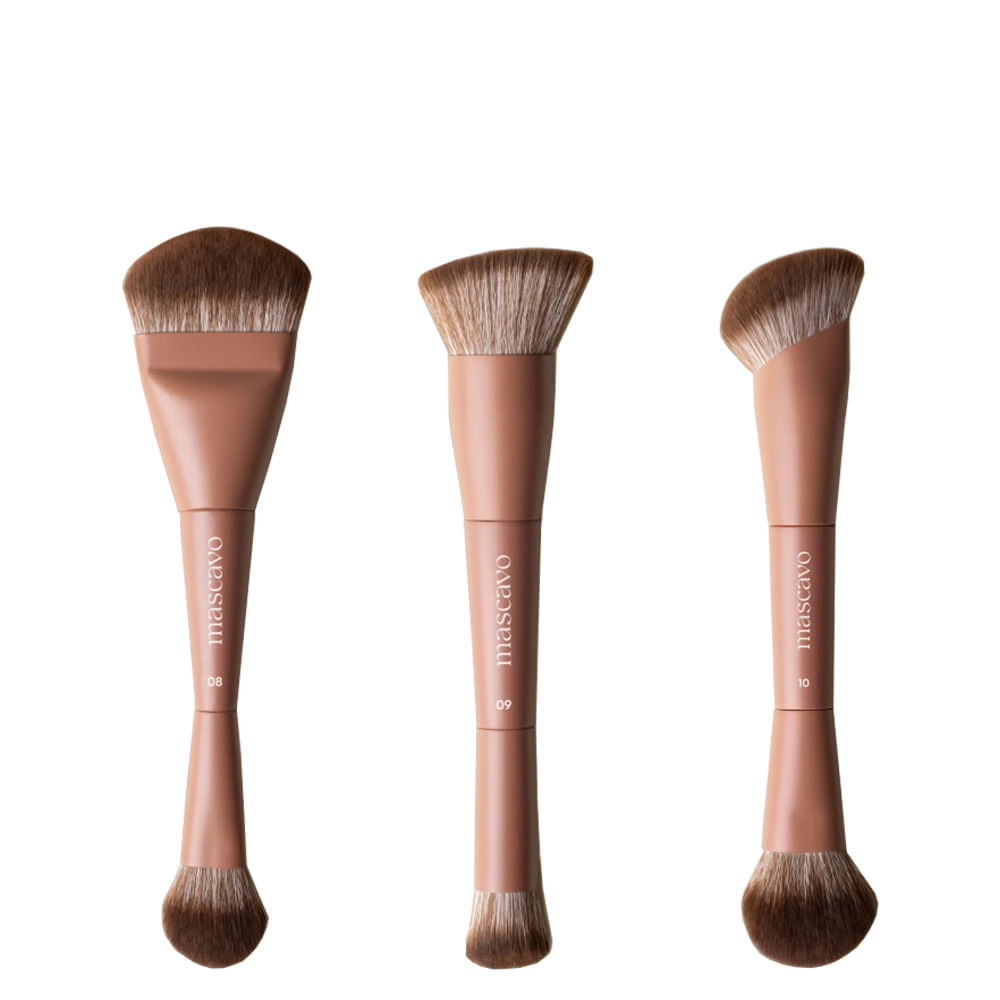 - Mascavo Pro Series 08 – Pincel Duplo Full Face: multifuncional para base, corretivo, contorno e acabamento; ideal para cobertura uniforme e polimento perfeito.