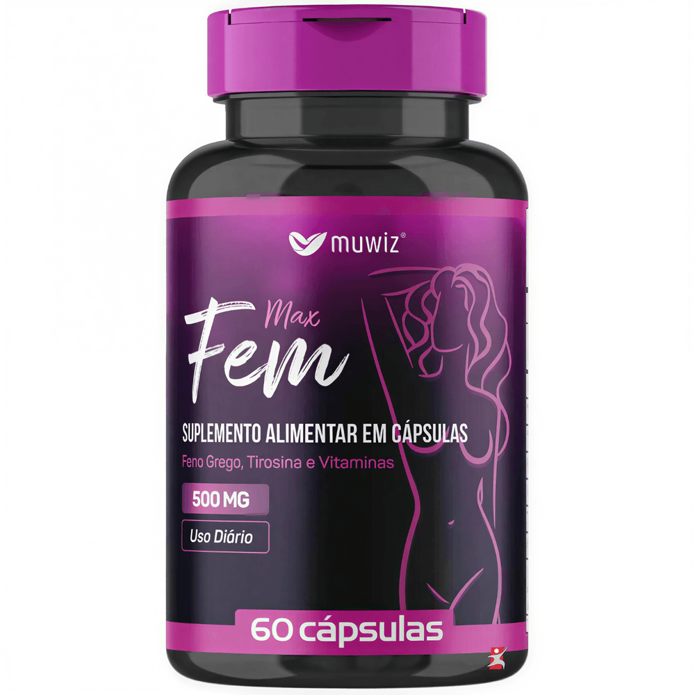 MAX FEM - FENO GREGO + TIROSINA + VITAMINA D + BIOTINA + VITAMINA E + ÁCIDO FÓLICO 60 CÁPSULAS - MUWIZ DESCRIÇÃOCuidadosamente pensado para atender às necessidades das mulheres, Max FemMuwiz contém Feno Grego, Tirosina e vitaminas essenciais para a manutenção da saúde feminina. O produto exerce influência na regulação do sistema circadiano da mulher. RECOMENDAÇÃO DE USOConsumir 02 cápsulas ao dia. TABELA NUTRICIONALAnexo nas imagens do anúncio. COMPOSIÇÃOExtrato de semente de feno grego (trigonellafoenum – graecumL.), L-Tirosina, Lecitina de soja, acetato de DL-alfa-tocoferol, amido de milho, ácido fólico, D – biotina, colecalciferol e antiumectante dióxido de silício. Cápsula: Gelatina, Glicerina (umectante). NÃO CONTÉM GLÚTEN. CUIDADOS DE CONSERVAÇÃO & RECOMENDAÇÕES & CUIDADOSConservar ao abrigo da luz, calor e umidade.Após aberto consumir em até 60 dias.Produto indicado para o grupo populacional acima de 19 anos.Este produto não é um medicamento.Não exceder a recomendação diária de consumo indicada na embalagem. Este produto não deve ser consumido por gestantes, lactantes e crianças. Mantenha fora do alcance de crianças. REGISTRO ANVISAProduto dispensado de registro conforme RDC 240/2018.