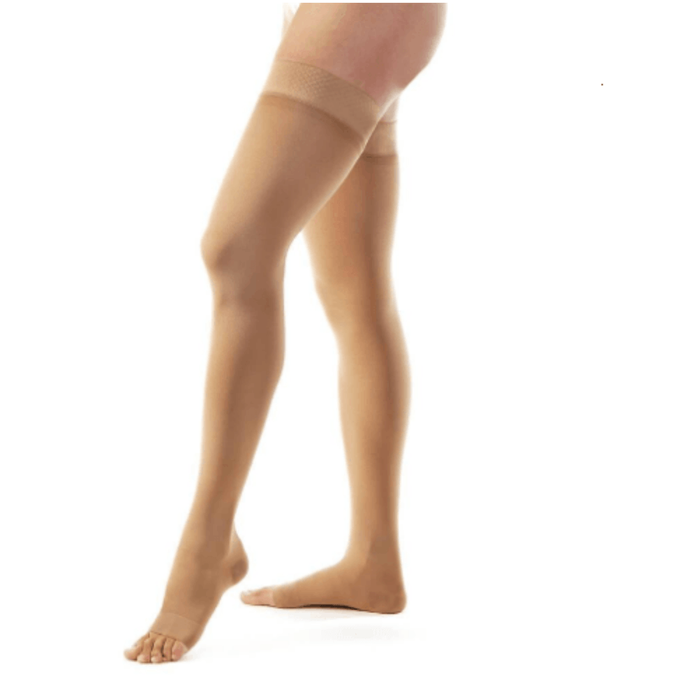 A Meia Elástica Meia-Coxa (7/8) Compressão 20-30mmHg - Ponteira Aberta - Bege - Jobst Relief possui tecido confortável e é indicada no tratamento de doenças venosas; Com textura macia e opaca, ela disfarça a aparência de veias varicosas e manchas; Exerce gradiente de compressão decrescente correta para alívio de dor e diminuição de edema; A maior compressão exercida no tornozelo, descrescendo até a coxa, evita o refluxo sanguíneo.