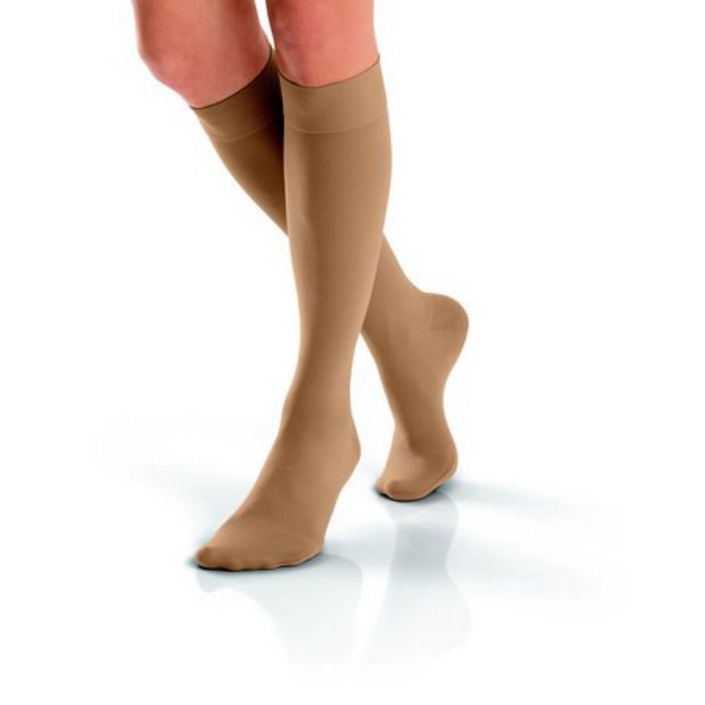 Meia Elástica Panturrilha Ponteira Fechada Compressão 20-30 mmHg Natural - Jobst Opaque foi desenvolvida para quem passa muito tempo em pé ou sentado e que tem sensação de peso e inchaço nas pernas.