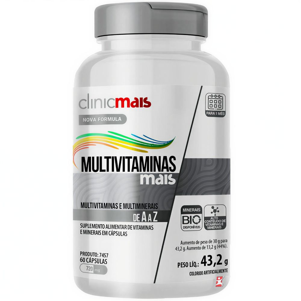 Multivitaminas Mais – 60 CápsulasO que é o Multivitaminas Mais?O Multivitaminas Mais é um suplemento alimentar formulado com um complexo de vitaminas e minerais essenciais para complementar a nutrição diária. Sua combinação equilibrada de nutrientes auxilia no suporte ao metabolismo, imunidade e funções essenciais do organismo. Ingredientes do Multivitaminas MaisO Multivitaminas Mais contém um mix completo de nutrientes fundamentais para o corpo: Vitaminas A, C e E – Possuem ação antioxidante, auxiliando na proteção celular contra os danos dos radicais livres.Complexo B (B1, B2, B3, B5, B6, B7, B9 e B12) – Contribui para o metabolismo energético, função neuromuscular e síntese de proteínas.Vitamina D – Essencial para a absorção de cálcio e manutenção da saúde óssea.Vitamina K – Participa do processo de coagulação sanguínea e saúde dos ossos.Minerais bioativos (Zinco, Selênio, Ferro, Cobre, Iodo, Magnésio e Cromo) – Importantes para o funcionamento do sistema imunológico, metabolismo celular e diversas funções do organismo.Muitas pessoas buscam multivitamínicos para complementar a alimentação e manter níveis adequados de nutrientes essenciais. Relatos frequentes incluem melhora na disposição diária, suporte ao sistema imunológico e auxílio na saúde da pele, unhas e cabelos. Pesquisas apontam que a ingestão adequada de vitaminas e minerais pode contribuir para a manutenção da função cognitiva, saúde cardiovascular e fortalecimento do sistema imune. O consumo contínuo de micronutrientes está associado a melhor desempenho metabólico e equilíbrio nutricional. O Multivitaminas Mais possui contraindicações?O produto é indicado para indivíduos com idade superior a 19 anos. Gestantes, lactantes e pessoas com condições médicas devem consultar um profissional da saúde antes do consumo. O Multivitaminas Mais é vegano?Não. O produto contém cápsulas de gelatina, um ingrediente de origem animal. Qual a forma correta de uso do Multivitaminas Mais?Quantidade diária recomendada: Ingerir 2 cápsulas ao dia.Horário ideal: Preferencialmente junto às refeições para melhor absorção.Consumo contínuo: Suplementos são um complemento alimentar e devem ser associados a uma alimentação equilibrada.O Multivitaminas Mais é regulamentado pela ANVISA?Sim. Este produto é dispensado de registro conforme a Resolução RDC nº 240/2018 da ANVISA. "ESTE PRODUTO NÃO É UM MEDICAMENTO. NÃO EXCEDER A RECOMENDAÇÃO DIÁRIA DE CONSUMO INDICADA NA EMBALAGEM. MANTENHA FORA DO ALCANCE DE CRIANÇAS."