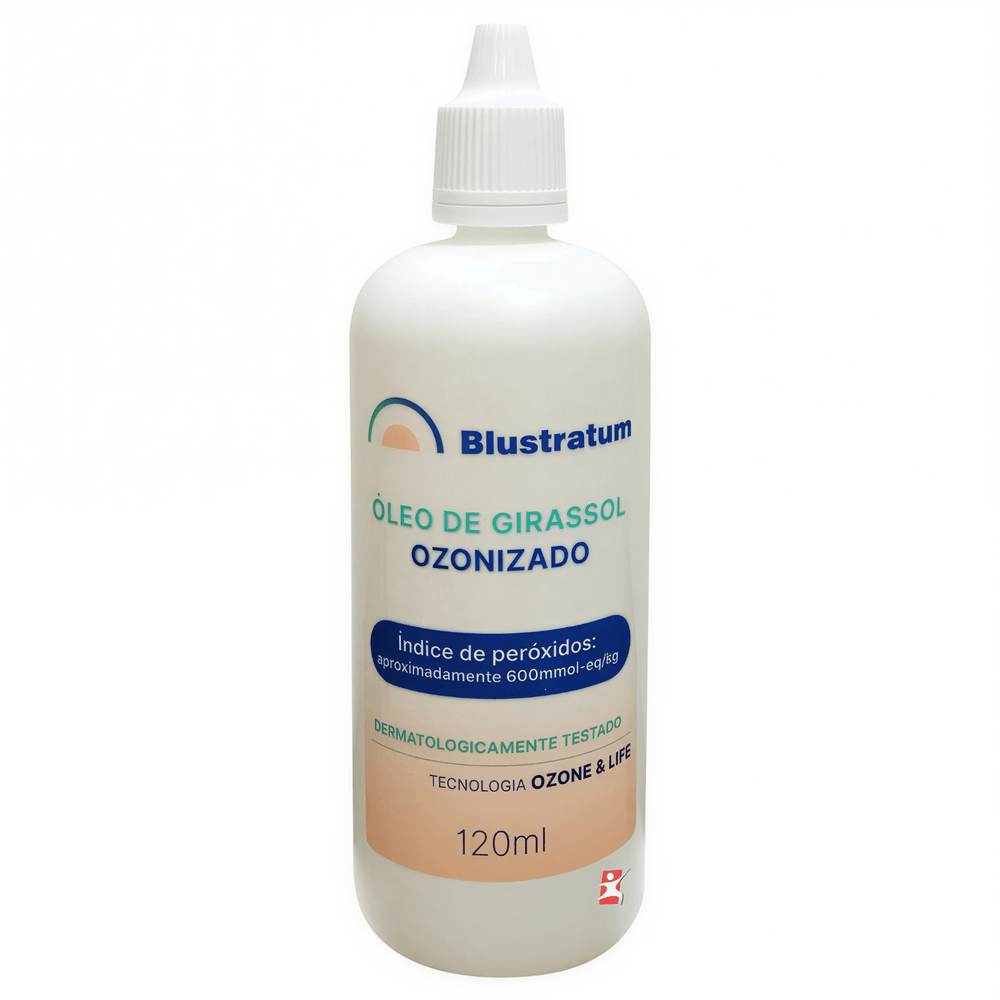 ÓLEO DE GIRASSOL OZONIZADO 120ML HIDRATANTE, CICATRIZANTE, TRATAMENTO - BLUSTRATUM O Óleo de Girassol Ozonizado Blustratum contribui para a defesa da pele contra microrganismos nocivos, enquanto auxilia no processo de reparo tecidual. Os ozonídeos ativos presentes no óleo melhoram o transporte de oxigênio, ajudando a estimular a microcirculação. Possui propriedades que fortalecem a função de barreira da pele, ajudando a manter o equilíbrio hídrico, e assim evitando a perda de água trans epidérmica, juntamente com propriedades hidratantes e reparadoras, que hidratam e nutrem profundamente a pele ao mesmo tempo que a protegem das agressões externas. COMO O ÓLEO VEGETAL SE TORNA UM ÓLEO OZONIZADO?Os óleos ozonizados são produzidos basicamente a partir de 2 ingredientes, o óleo vegetal e o gás ozônio. A incorporação da molécula de ozônio ao óleo vegetal resulta de uma reação química denominada ozonólise, onde o ozônio reage com as ligações duplas de carbono presente nas cadeias lipídicas. Essa reação produz uma série de novas moléculas como cetonas, aldeídos e vários compostos oxigenados, como hidroperóxidos, ozonídeos, peróxidos, diperóxidos e poliperóxidos. São essas novas moléculas como ozonídeos e peróxidos que são responsáveis pela ampla ação biológica dos óleos ozonizados. POR QUE A BLUSTRATUM ESCOLHEU OZONIZAR O ÓLEO VEGETAL DE GIRASSOL?O óleo vegetal de girassol é obtido a partir da semente da flor de girassol. O óleo vegetal de girassol apresenta na sua composição química predominância de ácidos graxos com dupla insaturação, sendo rico em ácidos linoleico (48- 74%) e oleico (14-39%), o que torna a sua estrutura química, devido a suas composições de ácidos graxos, ideal para ser ozonizado, já que que a quantidade de ozônio que os óleos são capazes de incorporar depende do grau de insaturação de seus ácidos graxos. INDICAÇÕES - Contribui para a defesa da pele contra microrganismos patogênicos;- Promove hidratação e nutrição da pele;- Auxilia a manter o equilíbrio hídrico, restringindo a perda de água transepidérmica;- Auxilia no processo de reparo tecidual;- Auxilia na ativação da microcirculação;- Ajuda na melhora do metabolismo celular de oxigênio;- Possui ação antioxidante ajudando no controle dos radicais livres;- Pode ser associado a diversos procedimentos estéticos, fisioterápicos e médicos. APLICABILIDADES DO ÓLEO DE GIRASSOL OZONIZADO- Auxilia no reparo tecidual;- Auxilia na defesa da pele;- Ajuda a fortalecer a barreira cutânea.  INDICADORES DE QUALIDADE DO ÓLEO DE GIRASSOL OZONIZADO BLUSTRATUMO índice ou valor de peróxido (IP) representa a quantidade de peróxido no produto, é um fator determinante na qualidade e é responsável pela ampla atividade biológica dos óleos ozonizados. Em geral, quanto maior o índice de peróxidos, menor a concentração Mínima Inibitória (CMI) para microrganismos. Para ter atividade antimicrobiana, o ideal é que o Índice de Peróxidos esteja ao redor de 600 meq/kg. O óleo de girassol ozonizado Blustratum é produzido com índice de peróxidos entre 500 e 600 mmolEq/Kg. DIFERENCIAIS DO ÓLEO DE GIRASSOL OZONIZADO BLUSTRATUM - Cruelty Free - Não testado em animais;-  100% Vegano - Não contém ingredientes de origem animal;- 100% natural e seguro: sem ingredientes ocultos;- 100% livre de conservantes e fragrâncias.- Óleo vegetal puro e oxigênio ativo O3;- Concentrado de compostos oxigenados na forma de ozonídeos ativos;- Dermatologicamente aprovado para uso tópico;- Fabricado no Brasil com registro na Anvisa. COMPOSIÇÃOSomente 2 ingredientes: óleo de semente de girassol (Helianthus annuus) e infusão com oxigênio ativo (ozônio - O3). MODO DE USO:Aplique o Óleo de Girassol Ozonizado Blustratum e massageie na pele até completa absorção, a aplicação pode ser realizada de 1 a 3 vezes ao dia ou conforme indicação por profissional. Deve ser utilizado de forma tópica. CONSERVAÇÃO E ARMAZENAMENTOO produto deve ser armazenado em local seco e arejado, não devendo ser exposto ao calor e raios solares. O Óleo de Girassol Ozonizado apresenta um tempo de validade de dois anos. CONTRAINDICAÇÃOEsse produto é contraindicado para pessoas com hipersensibilidade aos componentes da fórmula (óleo de semente de girassol).