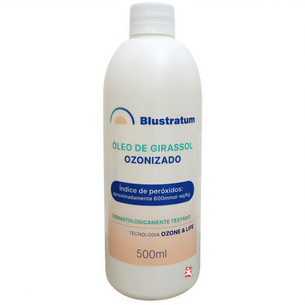 ÓLEO DE GIRASSOL OZONIZADO 500ML HIDRATANTE, CICATRIZANTE, TRATAMENTO - BLUSTRATUM O Óleo de Girassol Ozonizado Blustratum contribui para a defesa da pele contra microrganismos nocivos, enquanto auxilia no processo de reparo tecidual. Os ozonídeos ativos presentes no óleo melhoram o transporte de oxigênio, ajudando a estimular a microcirculação. Possui propriedades que fortalecem a função de barreira da pele, ajudando a manter o equilíbrio hídrico, e assim evitando a perda de água trans epidérmica, juntamente com propriedades hidratantes e reparadoras, que hidratam e nutrem profundamente a pele ao mesmo tempo que a protegem das agressões externas. COMO O ÓLEO VEGETAL SE TORNA UM ÓLEO OZONIZADO?Os óleos ozonizados são produzidos basicamente a partir de 2 ingredientes, o óleo vegetal e o gás ozônio. A incorporação da molécula de ozônio ao óleo vegetal resulta de uma reação química denominada ozonólise, onde o ozônio reage com as ligações duplas de carbono presente nas cadeias lipídicas. Essa reação produz uma série de novas moléculas como cetonas, aldeídos e vários compostos oxigenados, como hidroperóxidos, ozonídeos, peróxidos, diperóxidos e poliperóxidos. São essas novas moléculas como ozonídeos e peróxidos que são responsáveis pela ampla ação biológica dos óleos ozonizados. POR QUE A BLUSTRATUM ESCOLHEU OZONIZAR O ÓLEO VEGETAL DE GIRASSOL?O óleo vegetal de girassol é obtido a partir da semente da flor de girassol. O óleo vegetal de girassol apresenta na sua composição química predominância de ácidos graxos com dupla insaturação, sendo rico em ácidos linoleico (48- 74%) e oleico (14-39%), o que torna a sua estrutura química, devido a suas composições de ácidos graxos, ideal para ser ozonizado, já que que a quantidade de ozônio que os óleos são capazes de incorporar depende do grau de insaturação de seus ácidos graxos. INDICAÇÕES - Contribui para a defesa da pele contra microrganismos patogênicos;- Promove hidratação e nutrição da pele;- Auxilia a manter o equilíbrio hídrico, restringindo a perda de água transepidérmica;- Auxilia no processo de reparo tecidual;- Auxilia na ativação da microcirculação;- Ajuda na melhora do metabolismo celular de oxigênio;- Possui ação antioxidante ajudando no controle dos radicais livres;- Pode ser associado a diversos procedimentos estéticos, fisioterápicos e médicos. APLICABILIDADES DO ÓLEO DE GIRASSOL OZONIZADO- Auxilia no reparo tecidual;- Auxilia na defesa da pele;- Ajuda a fortalecer a barreira cutânea.  INDICADORES DE QUALIDADE DO ÓLEO DE GIRASSOL OZONIZADO BLUSTRATUMO índice ou valor de peróxido (IP) representa a quantidade de peróxido no produto, é um fator determinante na qualidade e é responsável pela ampla atividade biológica dos óleos ozonizados. Em geral, quanto maior o índice de peróxidos, menor a concentração Mínima Inibitória (CMI) para microrganismos. Para ter atividade antimicrobiana, o ideal é que o Índice de Peróxidos esteja ao redor de 600 meq/kg. O óleo de girassol ozonizado Blustratum é produzido com índice de peróxidos entre 500 e 600 mmolEq/Kg. DIFERENCIAIS DO ÓLEO DE GIRASSOL OZONIZADO BLUSTRATUM - Cruelty Free - Não testado em animais;-  100% Vegano - Não contém ingredientes de origem animal;- 100% natural e seguro: sem ingredientes ocultos;- 100% livre de conservantes e fragrâncias.- Óleo vegetal puro e oxigênio ativo O3;- Concentrado de compostos oxigenados na forma de ozonídeos ativos;- Dermatologicamente aprovado para uso tópico;- Fabricado no Brasil com registro na Anvisa. COMPOSIÇÃOSomente 2 ingredientes: óleo de semente de girassol (Helianthus annuus) e infusão com oxigênio ativo (ozônio - O3). MODO DE USO:Aplique o Óleo de Girassol Ozonizado Blustratum e massageie na pele até completa absorção, a aplicação pode ser realizada de 1 a 3 vezes ao dia ou conforme indicação por profissional. Deve ser utilizado de forma tópica. CONSERVAÇÃO E ARMAZENAMENTOO produto deve ser armazenado em local seco e arejado, não devendo ser exposto ao calor e raios solares. O Óleo de Girassol Ozonizado apresenta um tempo de validade de dois anos. CONTRAINDICAÇÃOEsse produto é contraindicado para pessoas com hipersensibilidade aos componentes da fórmula (óleo de semente de girassol).