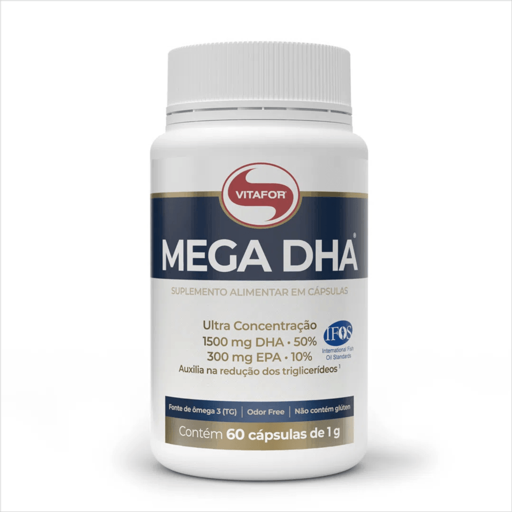 Mega DHA da Vitafor: Suplemento de Ômega 3 para um Coração e Cérebro SaudáveisO Mega DHA da Vitafor é um suplemento de ômega 3 à base de óleo de peixe ultra concentrado, desenvolvido para promover a saúde do coração e do cérebro. Cada porção recomendada contém uma concentração poderosa de 1500mg de DHA e 300mg de EPA, fundamentais para o funcionamento adequado desses órgãos vitais.A importância de cuidar da saúde do cérebro e do coração não pode ser subestimada. Ao longo dos anos, nossos hábitos alimentares passaram por mudanças significativas, com um aumento no consumo de açúcares, gorduras e alimentos pobres em nutrientes essenciais. Infelizmente, isso resultou em problemas de saúde, como altos níveis de colesterol e triglicerídeos, que afetam negativamente o bom funcionamento do coração.O ômega 3, presente na formulação do Mega DHA, é composto pelos ácidos graxos essenciais DHA e EPA. O DHA é conhecido por sua ação benéfica no sistema cognitivo, contribuindo para a melhoria da memória, atenção e saúde cerebral em adultos durante o envelhecimento. Já o EPA desempenha um papel crucial no sistema cardiovascular, promovendo um coração saudável.Além dos benefícios para os adultos, o DHA é essencial para o desenvolvimento do cérebro e da retina do feto. Durante a gestação, o feto recebe o DHA através da placenta, e após o nascimento, o leite materno continua a fornecer essa substância vital.Embora os óleos graxos estejam presentes na dieta através do consumo de peixes e frutos do mar, muitas vezes é difícil obter a quantidade necessária desses alimentos. Nesses casos, a suplementação com Mega DHA se torna uma solução prática e eficaz para suprir a ausência desses nutrientes essenciais na dieta, especialmente durante a gestação e a amamentação.O Mega DHA da Vitafor se destaca por sua forma de apresentação em TG (triglicerídeos), que facilita a absorção pelo corpo. Além disso, é um produto Premium que atende aos mais altos padrões de pureza, potência e frescor, garantindo a máxima qualidade.É importante ressaltar que cada pessoa possui necessidades individuais, por isso a Vitafor oferece diferentes concentrações na família de ômegas. Assim, é possível atender às recomendações de dosagem personalizadas feitas por profissionais de saúde.Comparando o Mega DHA e o Ômegafor Plus, podemos destacar que o Mega DHA oferece uma ultra concentração de 1500mg de DHA e 300mg de EPA por porção, ideal para aqueles que desejam uma maior concentração de DHA. Já o Ômegafor Plus apresenta uma alta concentração de óleos graxos, com 990mg de EPA e 660mg de DHA por porção, sendo uma opção adequada para aqueles que precisam de uma maior concentração de EPA, mantendo uma quantidade significativa de DHA.Além disso, diversos estudos científicos comprovam os múltiplos benefícios à saúde proporcionados pela suplementação de ômega 3. Destaca-se sua capacidade de reduzir os níveis de triglicerídeos, contribuindo para a saúde cardiovascular.No entanto, é importante tomar precauções na escolha do suplemento de ômega 3, pois alguns peixes podem estar contaminados por metais pesados. Esses metais podem comprometer a saúde ao serem ingeridos junto com o peixe contaminado. Por isso, é fundamental buscar produtos certificados internacionalmente, como o Mega DHA, que possui o selo IFOS™ de pureza e está livre de metais pesados.Ao optar pelo Mega DHA da Vitafor, você conta com diversos diferenciais. Além da certificação pelo Programa Internacional de Padrões de Óleo de Peixe (IFOS™), que garante a qualidade do produto, ele também possui o Selo de Qualidade VLabor. Sua formulação em TG proporciona maior absorção e conforto gástrico. O óleo é extraído de águas frias e profundas das regiões polares, garantindo sua pureza. E, por fim, seu alto teor de ultraconcentração de ômega 3, com 1500mg de DHA e 300mg de EPA, faz do Mega DHA uma escolha confiável.