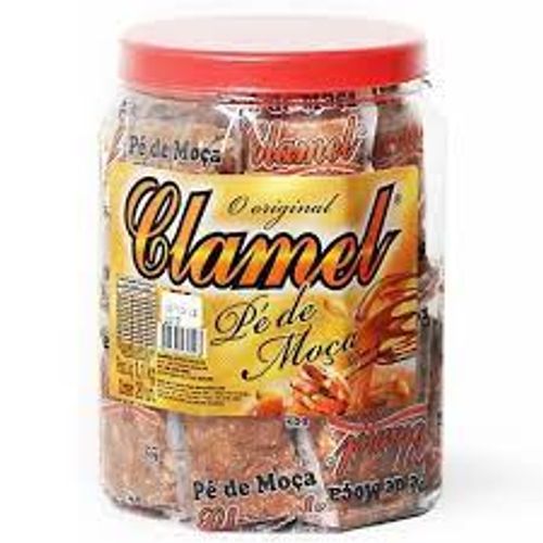 Doce de amendoim da CLAMEL tipo pé de moça em um pote com 20 unidades do doce macio e gostoso com pedaços de amendoim e coberto com açúcar cristal.