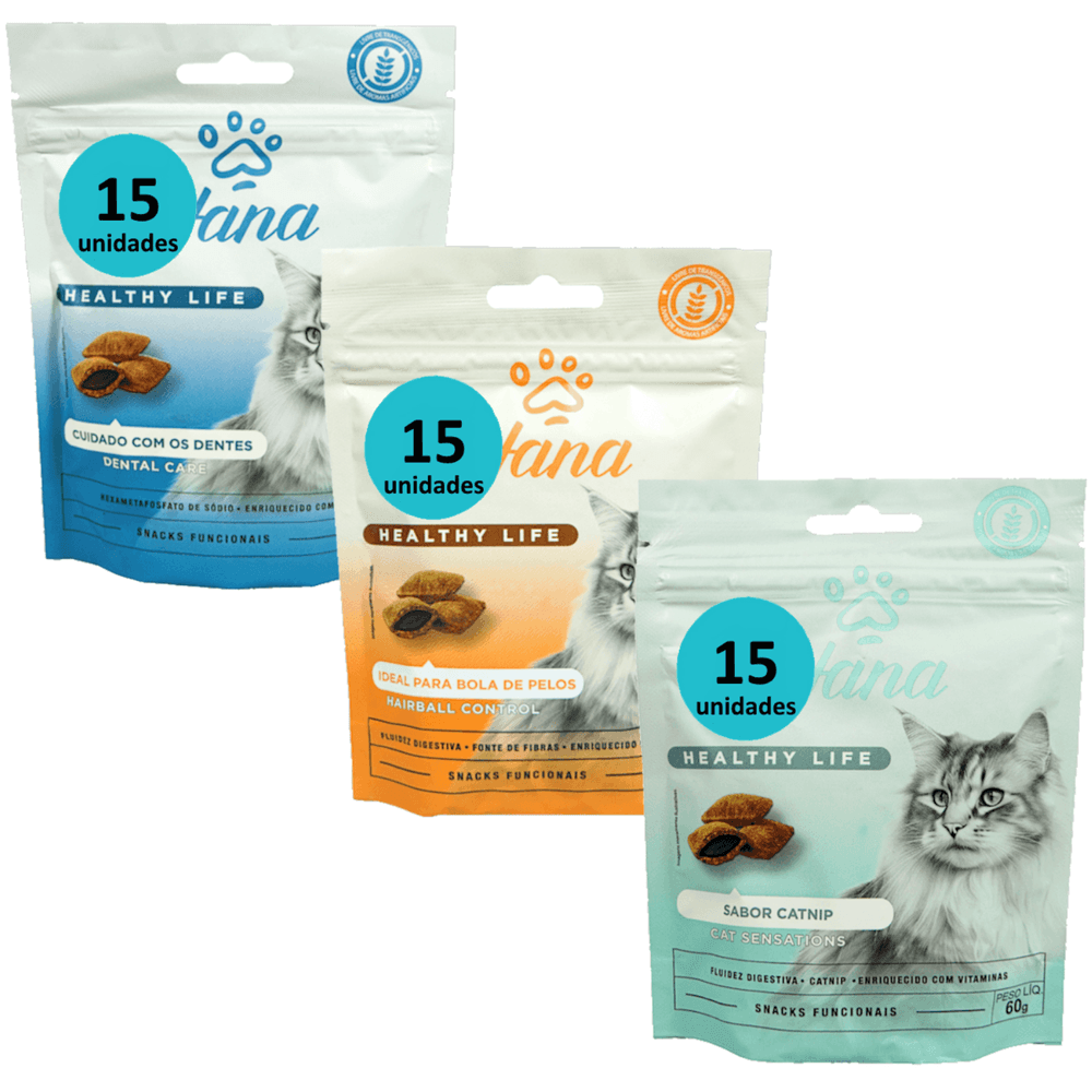 PETISCO SNACK HANA GATOS KIT COM 15 DENTAL + 15 HAIRBALL + 15 SENSATIONS
