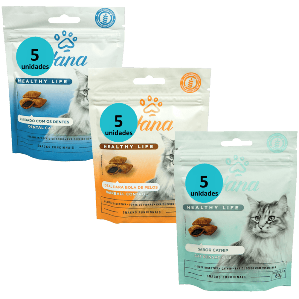 PETISCO SNACK HANA GATOS KIT COM 5 DENTAL + 5 HAIRBALL + 5 SENSATIONS