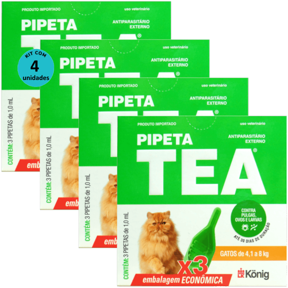 Pipeta Tea 1,0 ml Antiparasitário Contra Pulgas P/ Gatos de 4,1 até 8 Kg C/ 3 unid. Kit C/ 4 Cxs
