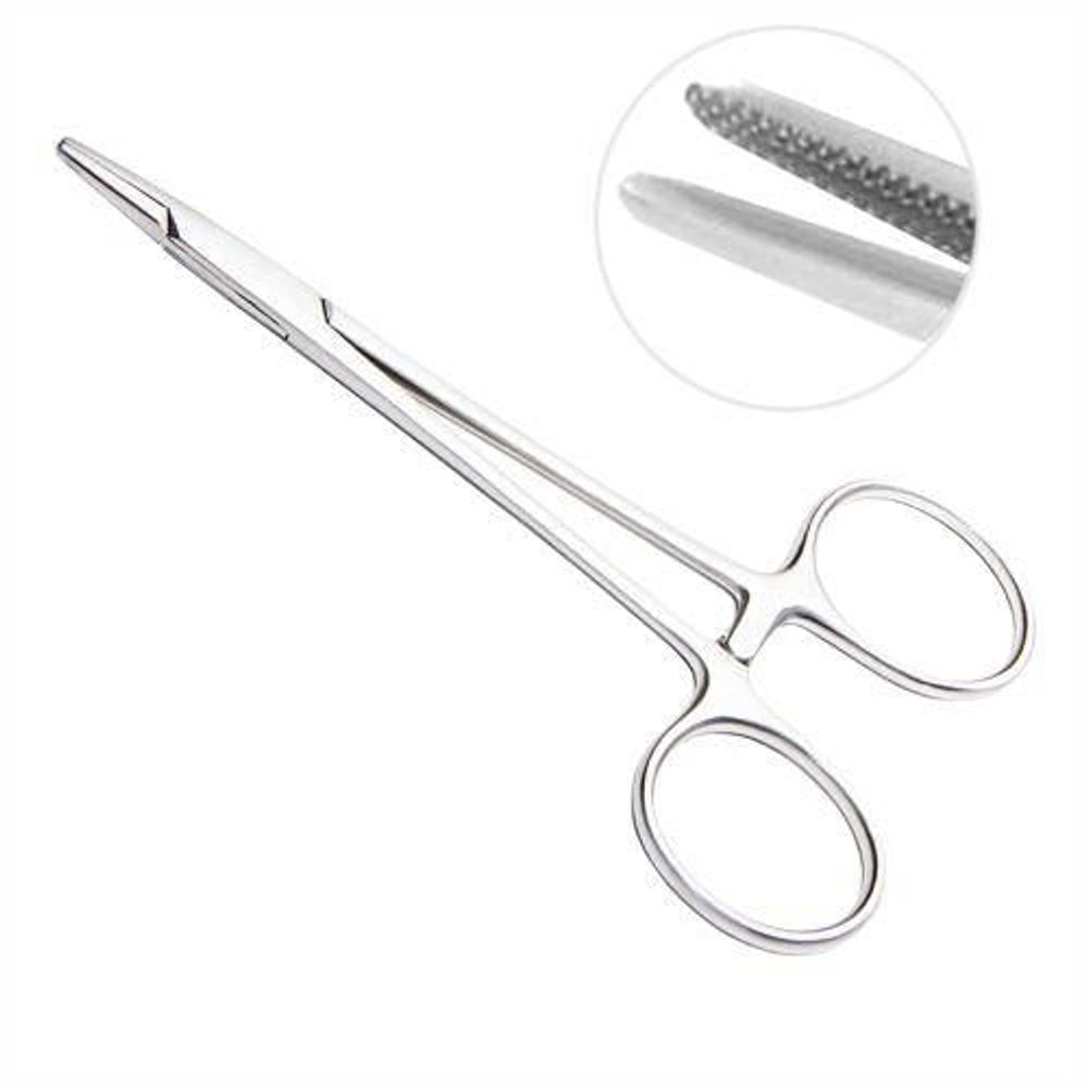 Instrumento cirúrgico usado para segurar uma agulha enquanto é feita a sutura de tecidos em cirurgias.