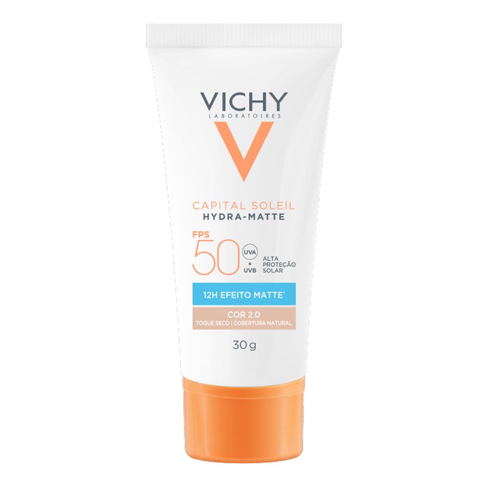 Protetor Solar Facial Vichy Capital Soleil Hydra Matte FPS50 Cor 2.0 30g. Proporciona alta cobertura, efeito mate e é resistente à água.