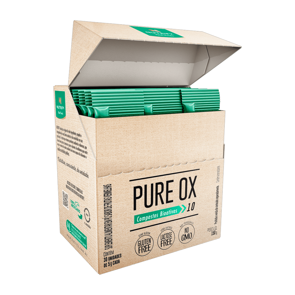 Compostos bioativos naturais. Potente ação antioxidante. Os nutrientes envolvidos na formulação do Pure OX atuam em sinergia e auxiliam na proteção dos danos causados pelos radicais livres. São compostos bioativos selecionados e variados: vitaminas, minerais e os principais polifenóis, que proporcionam um equilíbrio ideal para o seu organismo.