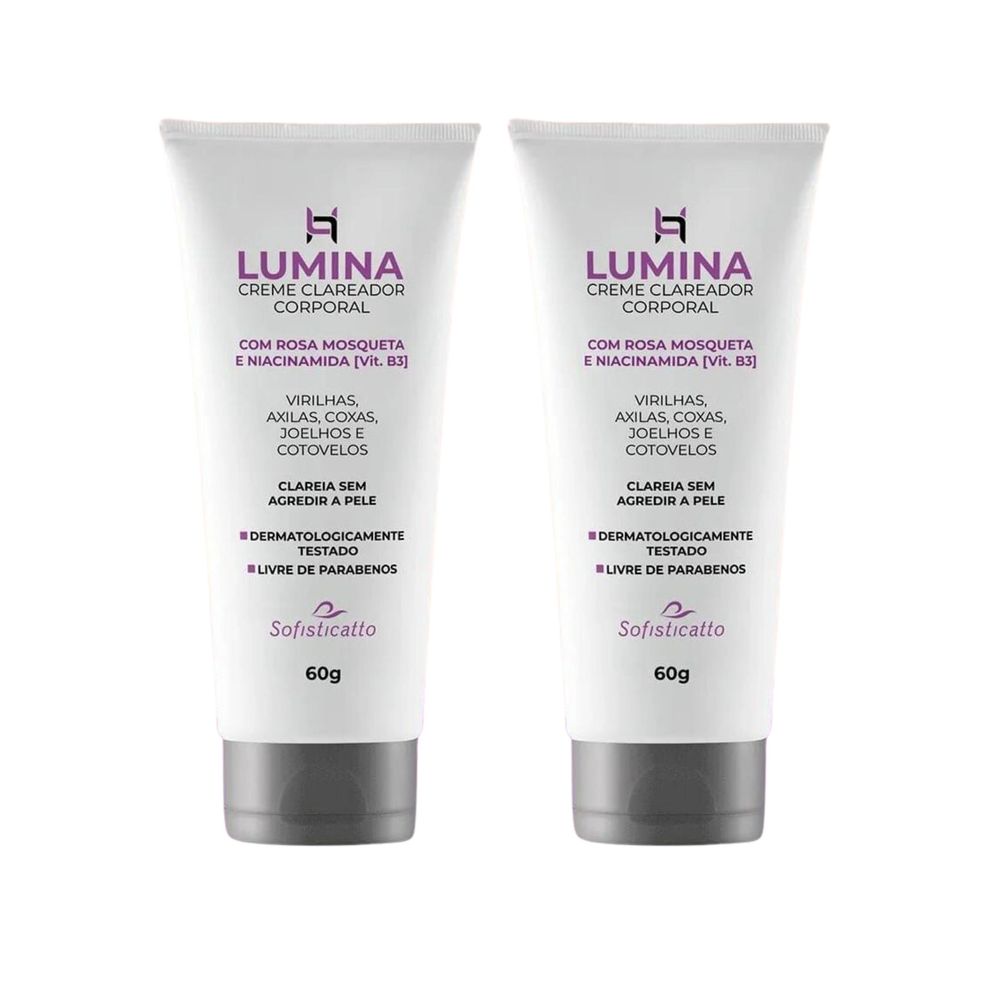 Sofisticatto Creme Clareador Corporal Lumina 60gAlguns locais do nosso corpo tendem a ficar com manchas mais escuras, como por exemplo, virilha, axila, joelho, entre coxas, cotovelo etc. Isso normalmente acontece por algum tipo de atrito no local, onde a pele escurece devido a uma resposta inflamatória que acaba estimulando a produção de melanina.  Esses atritos na maior parte das vezes são causados pelo uso da gilete durante a depilação, roupas muito justas, atrito entre coxas, cicatriz, arranhões devido a picadas de insetos e muito mais.Pensando no público que sofre com manchas escuras na pele, a Sofisticatto desenvolveu o Creme Clareador Corporal Lumina que deixará a pele das regiões da virilha, axila, joelho, coxas, cotovelo com um tom muito mais uniforme e iluminado.O Creme Corporal Lumina possui ingredientes cuidadosamente selecionados como a Rosa Mosqueta, que ajuda a clarear, regenerar e hidratar a pele, além de oferecer ação iluminadora e de antienvelhecimento. A Vitamina B3 presente na fórmula, também oferece ação antioxidante, hidratante, além de combater o envelhecimento precoce da pele.Lumina é livre de parabenos, dermatologicamente testado e clareia sem agredir!PRINCIPAIS BENEFÍCIOSClareia a pele sem agredirCorrige a diferença de tonalidade da regiãoDeixa a pele hidratada e iluminadaLivre de parabenos e dermatologicamente testadoANVISA: Processo 25351.261293/2022-64 AFE: 2.03567.6Dúvidas Frequentes:Gestante pode utilizar o Creme Clareador Sofisticatto?Apesar do fabricante não informar restrições para o uso em gestante o médico sempre deverá ser consultado antes.Em quanto tempo terei resultado?Aplicando o creme de maneira correta diariamente, os resultados irão aparecer em poucas semanas gradualmente.Modo de usar: Aplicar na região desejada massageando suavemente de preferência antes de dormir. Não expor a área ao sol durante o uso e utilizar sempre o filtro solar. Dica de uso para otimizar o resultado: Faça uma esfoliação 2x na semana no local e utilize um creme hidratante diariamente.Precauções: Uso Externo. Não usar sobre a pele lesionada. Em caso de irritação suspender o uso e se necessário procurar um médico. Conservar em local fresco e arejado e longe do alcance de crianças. ---------------------------------------------------------------Principais Tags de Pesquisa: clareador de virilha, clarear virilha, clareamento de virilha, creme para clarear virilha, clarear virilha escura, clareador de axilas, clarear axila, clarear entre as pernas, como clarear as coxas, manchas na coxa, como tirar manchas escuras entre as pernas e virilha, clarear joelhos, como clarear o joelho, como clarear joelhos e cotovelos, clareador de cotovelo, creme para clarear cotovelo, hidratante clareador corporal, clareador íntimo, creme clareador intimo, sofisticatto creme clareador, óleo de rosa mosqueta clareia manchas, rosa mosqueta clareia a pele, rosa mosqueta clareia a pele, creme clareador rosa mosqueta