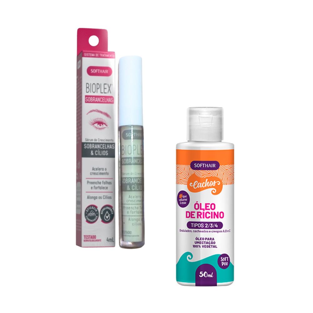 Sérum de Crescimento Cílios e Sobrancelhas Bioplex Soft Hair 4mlVocê sonha em ter sobrancelhas e cílios deslumbrantes que realcem a beleza do seu rosto? O Sérum para Crescimento de Sobrancelhas e Cílios Bioplex é a resposta pois você pode finalmente conquistar aquele visual deslumbrante que sempre desejou de forma mais natural.O Sérum Bioplex Sobrancelhas e Cílios Bioplex age a partir das propriedades de um ativo 100% vegetal e exclusivo que aumenta a proliferação das células que permitem o crescimento acelerado, preenchimento de falhas e fortalecimento da raiz do pelo — o que resulta em maior resistência à queda do fio por atritos diversos.O Sérum é hipoalergênico e dermatologicamente testado para garantir que seja seguro para todos os tipos de pele e minimizar o surgimento de possíveis alergias. Não possui efeito vasodilatador. A Linha Bioplex Soft Hair é um sistema de tratamento do bulbo capilar para aceleração do crescimento e combate a queda dos fios. Essa linha passa por testes de segurança e eficácia por percepção de voluntários e medição de aparelhos.80% dos voluntários que utilizaram o Bioplex Sérum Sobrancelhas e Cílios aprovaram os benefícios abaixo:- Aceleramento e crescimento dos fios;- Preenchimento de falhas- Fortalecimento da raiz do pelo- Alongamento dos cílios- Aumento do volume e densidade de cílios e sobrancelhas- Pele livre ressecamentoPergunta frequente:Quanto tempo devo utilizar o Sérum Bioplex para obter o resultado desejado?O Sérum Bioplex é um tratamento com resultado progressivo. Utilizando o produto de 1 a 2x ao dia o efeito começa aparecer em algumas semanas. Para melhores resultados e conforme resultado do estudo mencionado acima, o ideal é que mantenha o tratamento por 90 dias ou até obter os resultados desejados. Resultados são individuais podem variar de pessoa para pessoa.ANVISAPROCESSO: 25351.380034/2023-12 AFE: 2.01236-1 -------------------------------------------------Óleo de Ricino Capilar Soft Hair 50mlO Óleo de Ricino Capilar da Soft Hair é puro, 100% vegetal, livre de sulfatos, petrolatos e parabenos.O óleo de rícino é rico em nutrientes essenciais que estimulam os folículos capilares, promovendo um crescimento acelerado. Com seu uso regular, você notará o cabelo ganhando comprimento de forma saudável e impressionante.Fortalecimento dos Fios:A quebra e a queda de cabelo podem ser frustrantes, mas o óleo de rícino é um verdadeiro salvador. Sua composição única de ácidos graxos fortalece a fibra capilar, reduzindo a quebra e a queda, resultando em cabelos mais fortes e resistentes.Hidratação Profunda:Cabelos secos e danificados? O óleo de rícino é um hidratante natural poderoso, capaz de penetrar profundamente na fibra capilar e reter a umidade. Adeus, fios ressecados e sem vida - olá, cabelos sedosos e brilhantes!O óleo de rícino é uma verdadeira joia quando se trata de cuidados capilares. ANVISAProcesso: 25351.633530/2018-17 AFE: 2.01236.1INGREDIENTES:Ricinus Communis Seed Oil (Óleo de Ricino)-------------------------Tags de Pesquisaóleo de rícino puro, oleo de ricino puro, oleo de ricino natural, oleo de ricino puro no cabelo, óleo de rissa, oleo ricino, oleo de ricino capilar, oleo de ricino 100 natural, melhor oleo de ricino, ricino pro cabelo, ricino pro cabelo, oleo de ricino qual o melho, oleo de ricino crescimento capilar, oleos para umectação, oleo para umectação, oleo de umectação umectação cabelo,sérum para crescimento de cílios, sérum para crescimento de sobrancelhas, como fazer os cílios crescerem, produto para cílios mais longos, tratamento para cílios ralos, sérum para sobrancelhas falhadas, cílios naturais mais longos, acelerador de crescimento de cílios, sérum para sobrancelhas grossas, cílios mais espessos e volumosos, crescimento natural de cílios e sobrancelhas, produtos para sobrancelhas finas, sérum para cílios curtos, fortalecimento de cílios e sobrancelhas, tratamento para sobrancelhas desiguais, cilios cresce, serum cílios, melhor produto para crescer cílios, serum para sobrancelha , serum crescimento cílios, serum crescimento cilios e sobrancelhas bioplex, produtos para crescer sobrancelha, serum cilios e sobrancelhas, fortalecedor de cilios e sobrancelhas, crescer cilios rápido, cilios crescer de novo, cilios crescem novamente