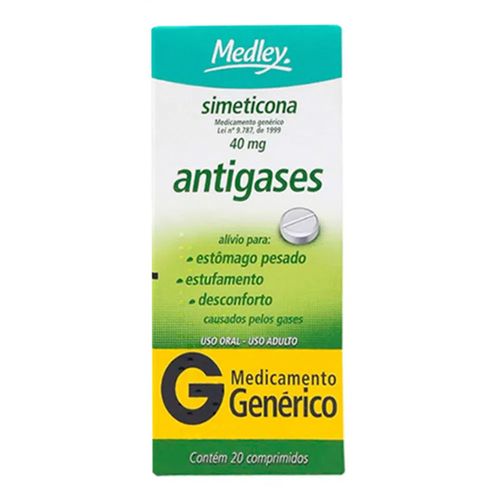 Simeticona 40mg Genérico Medley 20 Comprimidos é um medicamento utilizado para aliviar o desconforto, sensação de estufamento, estômago pesado, dor e cólicas abdominais provocados por gases; como auxiliar no preparo para exames médicos como endoscopia e colonoscopia.