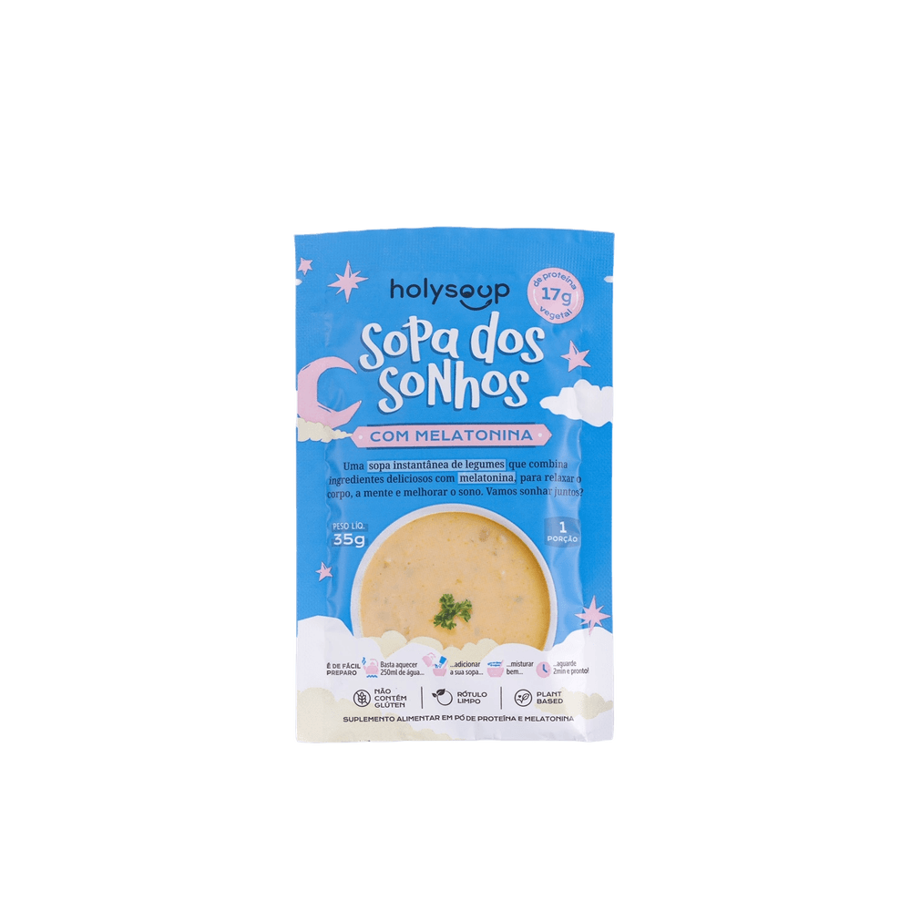 A Sopa dos Sonhos com Melatonina Sachê Holysoup leva a combinação perfeita entre melatonina e proteína, para uma noite de sono tranquila e restauradora._x005F_x005F_x005F_x000D_  _x005F_x005F_x005F_x000D_ A Sopa dos Sonhos com Melatonina Sachê Holysoup possui 17g de proteína por porção, ajudando a manter a saciedade noturna, além de facilitar o relaxamento do corpo e da mente para um sono profundo e reparador._x005F_x005F_x005F_x000D_  _x005F_x005F_x005F_x000D_ Ingredientes: Proteína isolada de ervilha, flocos de mandioquinha, flocos de abóbora, cebola em pó, levedura nutricional, tomate desidratado, sal, espessante goma xantana, cúrcuma em pó, alho desidratado, salsa desidratada, cebolinha desidratada, mix de nutrientes (vitamina B9 (cloridrato de piridoxina) e melatonina) e pimenta preta em pó. NÃO CONTÉM GLÚTEN. _x005F_x005F_x005F_x000D_ ALÉRGICOS: PODE CONTER LEITE, CASTANHA DE CAJU, CASTANHA DO BRASIL E NOZ PECAN._x005F_x005F_x005F_x000D_  _x005F_x005F_x005F_x000D_  _x005F_x005F_x005F_x000D_ Sobre a marca: A Holysoup surgiu em um momento onde a busca por alimentação leve e saudável ganha muita força, mas sentimos a necessidade de descomplicar para tornar essa busca um hábito mais leve e descomplicado._x005F_x005F_x005F_x000D_ Exploramos ingredientes naturais, pois acreditamos que a peça chave para uma vida mais saudável está no que comemos. E o mais legal disso não é apenas o que colocamos em nossas sopas, mas sim o que deixamos de fora.  _x005F_x005F_x005F_x000D_ Comer bem pode ser mais simples do que você imagina com a Holysoup._x005F_x005F_x005F_x000D_  _x005F_x005F_x005F_x000D_ Sobre a Boomi: A Boomi é  um mercado online com produtos saudáveis e sustentáveis, que fazem bem à saúde e ao planeta. São mais de 3.500 produtos de 150 pequenas marcas para você!_x005F_x005F_x005F_x000D_ Nascemos pequenos, mas com um propósito gigante: conectar pessoas a produtos acessíveis que tragam benefícios para a saúde, para o planeta e para a sociedade. Para isso, buscamos ofertar produtos de pequenos agricultores e pequenas empresas em um mundo cada vez mais veloz e que busca mais produtividade. Vamos sempre buscar levar o melhor para você!_x005F_x005F_x005F_x000D_ Nosso propósito é conectar alimentos saudáveis e produtos naturais e sustentáveis a pessoas preocupadas com a sua saúde e com a saúde do planeta. Com preço justo, comodidade e informações confiáveis._x005F_x005F_x005F_x000D_ Curadoria: Nossos produtos são criteriosamente validados pela nossa curadoria de produtos saudáveis, que busca produtores e empresas que compartilham do nosso alto padrão de qualidade. Da enorme lista de ingredientes banidos à preocupação do bem estar animal, desde o primeiro dia seguimos fieis aos nossos valores, trabalhando com transparência e práticas sustentáveis. Vendemos apenas produtos que admiramos e que nos orgulha.