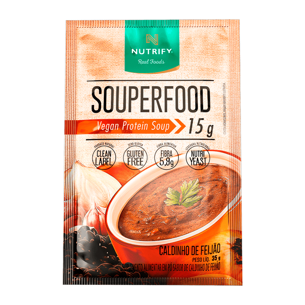 Alta densidade nutritiva. Gostinho que alimenta a alma. Souperfood Nutrify é um suplemento proteico com sabor aconchegante de sopinha caseira, feito com ingredientes naturais. Sua base é a proteína de ervilha, uma ótima fonte vegetal de aminoácidos essenciais. Conta também com levedura nutricional de origem orgânica e fibras prebióticas.