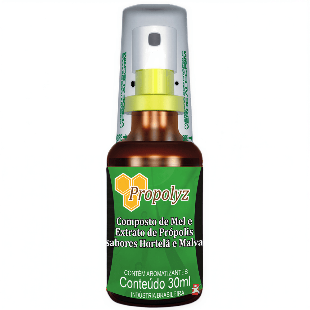 SPRAY VERDE - MEL E PRÓPOLIS COM HORTELÃ E MALVA 30ML - PROPOLYZ Todos os sprays da Propolyz são elaborados com Própolis Verde Alecrim. A própolis Verde Alecrim é produzida na região do Centro Oeste de Minas Gerais, nos apiários da empresa Natucentro e coletada nas colmeias por apicultores especializados. É conhecida internacionalmente como própolis verde. Green própolis, a qual tem como principal fonte vegetal a planta (Baccharis Dracunculifolia), alecrim do campo ou popular vassourinha, possuindo uma coloração verde.É considerada a melhor própolis do mundo, sendo amplamente consumida no Japão. Própolis é uma substância resinosa obtida pelas abelhas através da coleta de resinas da floras (pasto apícola) da região, e alteradas pela ação das enzimas contidas em sua saliva. A cor, sabor e o aroma da própolis variam de acordo com a origem botânica. As abelhas produzem o própolis em defesa da colméia, elas recobrem a entrada a fim de protegê-las contra fungos e bactérias. NÃO CONTÉM GLÚTEN