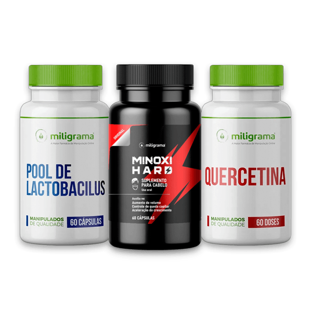 Benefícios: - Ajuda a diminuir a queda de cabelo e promove o crescimento; - Ajuda a fortalecer os fios e aumentar o volume de crescimento; - Melhora a absorção de nutrientes; - Combate os radicais livres; Dicas para potencializar a suplementação: - Evite usar produtos químicos fortes como tinturas e progressivas, já que os fios estão mais frágeis e sensíveis. - Ajude a nutrição com uma alimentação rica em vitaminas, com frutas, legumes e oleaginosas para promover melhor aporte desses nutrientes aos cabelos. O que é? Durante a infecção por Covid-19, podem ocorrer sintomas como febre, estresse, traumas, uso de medicamentos, deficiência nutricional, entre outros. Com isso, para combater o vírus e devolver a saúde ao indivíduo, o organismo procura retirar os nutrientes necessários para esse combate de locais menos importantes, como as unhas e cabelos. E é aí que começa uma das 5 sequelas mais comuns da infecção pelo vírus da Covid-19: a queda de cabelo. Os radicais livres formados pelo estresse celular sofrido acabam atacando ainda mais as proteínas de estrutura dos fios e, como ele está desnutrido pela compensação para órgãos mais importantes, não consegue resistir ao dano e caem em quantidades expressivas. Por isso, para uma boa regeneração capilar, é indispensável nutrir os fios novamente, combater os radicais livres formados e melhorar a absorção intestinal de nutrientes provenientes da alimentação. Tudo isso está disponível no Kit para combate à queda de cabelo pós Covid-19. Como agem os produtos? Minoxihard é um composto exclusivo da Miligrama com ativos especialmente selecionados para diminuir a queda e promover o crescimento saudável dos cabelos. Pode ser usado por homens e mulheres e promove a restauração de dentro para fora, nutrindo os fios com vitaminas, minerais, aminoácidos e proteínas estruturais indispensáveis para o fortalecimento e saúde dos cabelos. A Quercetina é um flavonóide de origem natural com uma grande potência antioxidante. Ela combate de forma muito eficaz os radicais livres formados durante o estresse da infecção pelo vírus que atacam os fios de cabelo. Além disso, por sua potente ação antioxidante, ela promove uma proteção cardiovascular e contra doenças degenerativas e cancerígenas. Por fim, o Pool de Lactobacillus promove o restabelecimento da flora intestinal melhorando a absorção de nutrientes provenientes da alimentação e ainda combatendo os radicais livres e normalizando as atividades fisiológicas normais do organismo. Uma flora saudável é essencial para a absorção e fixação de vitaminas no organismo. Composição: Minoxihard Capilar 60 doses + Quercetina 500mg 60 doses + Pool de Lactobacillus 60 doses Modo de usar: Minoxihard Capilar Oral = Tomar 1 dose ao dia Quercetina = Tomar uma dose 2 vezes ao dia Pool de Lactobacillus = Tomar 1 dose à noite Advertências: 1. Nunca compre medicamento sem orientação de um profissional habilitado. 2. Imagens meramente ilustrativas. 3. Pessoas com sensibilidade à substância não devem ingerir o produto. 4. Em caso de hipersensibilidade ao produto, recomenda- se descontinuar o uso e consultar o médico. 5. Não use o medicamento com o prazo de validade vencido. 6. Manter em temperatura ambiente (15 a 30ºC). Proteger da luz, do calor e da umidade. Nestas condições, o medicamento se manterá próprio para o consumo, respeitando o prazo de validade indicado na embalagem. 7. Todo medicamento deve ser mantido fora do alcance das crianças. 8. Este medicamento não deve ser utilizado por mulheres grávidas ou lactantes sem orientação médica. 9. Este medicamento não deve ser utilizado por menores de 18 anos sem orientação médica. 10. Este medicamento não deve ser partido ou mastigado. 11. Siga corretamente o modo de usar. Não desaparecendo os sintomas, procure orientação médica. 12. Os resultados e indicações referentes ao uso desse produto foram avaliados e comprovados pelos fabricantes dos insumo farmacêuticos e por estudos que comprovam as ações dos mesmos, conforme descrito nas referências bibliográficas. Não garantimos os resultados descritos, estes variam de pessoa para pessoa dependendo de diversos fatores como alimentação, prática de exercícios físicos, presença de outras patologias, bem como, o uso correto do produto conforme descrito na posologia. 13. "SE PERSISTIREM OS SINTOMAS, O MÉDICO DEVERÁ SER CONSULTADO" 14. Venda sob prescrição de profissional habilitado, podendo este ser o nosso farmacêutico de acordo com a Resolução 586/2013 do Conselho de Farmácia. Consulte-o! Referências: 1. Literatura do fornecedor;