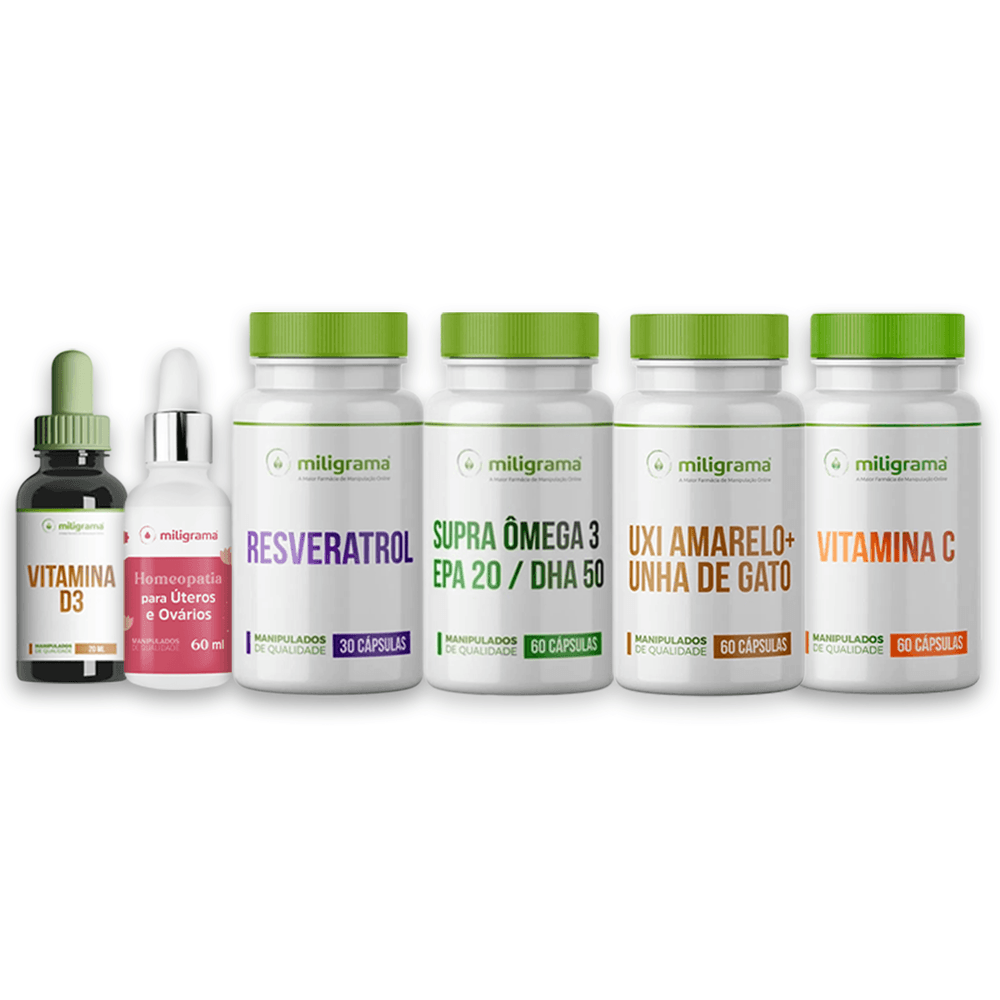 Benefícios: - Auxilia no tratamento de miomas e nos ovários policísticos; - Ajuda no combate da inflamação uterina; - Coadjuvante no tratamento da endometriose; - Ajuda na menstruação irregular; - Auxilia no tratamento das inflamações urinárias; - Atua como potente antioxidante; - Auxiliar no fortalecimento do sistema imune; O que é? O útero e os ovários são órgãos extremamente importantes na saúde feminina, pois é através deles que ocorre toda a regulação hormonal e a fertilidade. À medida que a mulher vai envelhecendo, os hormônios se modificam e alguns reduzem a produção, o que pode levar ao desenvolvimento de maior incidência de inflamações e infecções. Por outro lado, alguns problemas são independentes da idade e podem chegar desde cedo, como miomas e a síndrome de ovários policísticos. Para combater esses problemas e auxiliar nos tratamentos, a Miligrama montou um kit de produtos especiais para a saúde do útero e dos ovários, com vitaminas, fitoterápicos e elementos antioxidantes que vão preservar a saúde e combater as inflamações e infecções dos úteros e ovários, podendo melhorar a fertilidade e o equilíbrio hormonal. Como agem os produtos? O Uxi amarelo em conjunto com a unha de gato forma um poderoso composto natural no tratamento de miomas (caroços), ovários policísticos, inflamação uterina, endometriose, menstruação irregular, inflamações urinárias, reumatismo, gastrite e prevenção de câncer. Tem-se mostrado extremamente eficaz em casos de miomas.Esta combinação vem surpreendendo médicos e pacientes no bem estar e na saúde da mulher. Poucas pessoas sabem dos benefícios que esta combinação traz quando o assunto se refere a miomas ou alguma inflamação dos ovários e útero. A Vitamina C, também conhecida como ácido ascórbico, é uma vitamina hidrossolúvel que atua no funcionamento normal do corpo. Atua como coenzima e, sob determinadas condições, como agente redutor e antioxidante. O seu uso também tem sido preconizado para aumentar a imunidade e a resistência a infecções e como antioxidante para captação de radicais livres. O Ômega 3 é um ácido graxo poli-insaturado que é essencial à saúde humana que precisa ser ingerido através da alimentação. Nos últimos anos, estudos científicos tem comprovado que dietas com boas quantidades de ômega 3 desempenham papel importante na prevenção e tratamento de doenças cardiovasculares e aterosclerótica, doenças inflamatórias, auxiliam no crescimento e desenvolvimento fetal e neural, além de diminuir a vasoconstrição e agregação plaquetária. Vitamina D3 é um hormônio esteróide sintetizado naturalmente pelo nosso organismo (endógeno), porém, a maior parte da sua produção é dependente da exposição da pele ao sol. Faz a manutenção óssea, e está fortemente ligada com o sistema imunológico e sua deficiência pode aumentar o risco de infecções e inflamações por todo o organismo, incluindo os úteros e ovários. O resveratrol possui uma potente ação antioxidante que pode auxiliar na prevenção de tumores e inflamações que levam a doenças crônicas. É também considerado um grande auxílio na promoção da longevidade, pois é capaz de combater os radicais livres causadores de problemas cardíacos, metabólicos e neurológicos. A Homeopatia para úteros e ovários é uma associação de ativos homeopáticos que vão auxiliar no tratamento de miomas e pólipos e na síndrome de ovário policístico. Composição: Uxi amarelo 250mg + Unha de gato 250mg 60 cápsulas Vitamina C 500mg 60 cápsulas Supra Ômega 3 1000mg 60 cápsulas Vitamina D3 400 UI/gota 20ml Resveratrol 20mg 30 cápsulas Homeopatia para úteros e ovários 60ml Modo de usar: Uxi amarelo + Unha de gato: Tomar 1 cápsula 2x ao dia. Vitamina C: Tomar 1 cápsula 2x ao dia. Supra Ômega 3: Tomar 1 cápsula 2x ao dia. Vitamina D3: Tomar 5 gotas ao dia. Resveratrol 20mg: Tomar 1 cápsula ao dia. Homeopatia para úteros e ovários: Tomar 10 gotas 3x ao dia. Venda sob prescrição de profissional habilitado, podendo este ser o nosso farmacêutico de acordo com a Resolução 586/2013 do Conselho de Farmácia. Consulte-o! Validade: 4 meses. Advertências: 1. Nunca compre medicamento sem orientação de um profissional habilitado. 2. Imagens meramente ilustrativas. 3. Pessoas com sensibilidade à substância não devem ingerir o produto. 4. Em caso de hipersensibilidade ao produto, recomenda- se descontinuar o uso e consultar o médico. 5. Não use o medicamento com o prazo de validade vencido. 6. Manter em temperatura ambiente (15 a 30ºC). Proteger da luz, do calor e da umidade. Nestas condições, o medicamento se manterá próprio para o consumo, respeitando o prazo de validade indicado na embalagem. 7. Todo medicamento deve ser mantido fora do alcance das crianças. 8. Este medicamento não deve ser utilizado por mulheres grávidas ou lactantes sem orientação médica. 9. Este medicamento não deve ser utilizado por menores de 18 anos sem orientação médica. 10. Este medicamento não deve ser partido ou mastigado. 11. Siga corretamente o modo de usar. Não desaparecendo os sintomas, procure orientação médica. 12. Os resultados e indicações referentes ao uso desse produto foram avaliados e comprovados pelos fabricantes dos insumo farmacêuticos e por estudos que comprovam as ações dos mesmos, conforme descrito nas referências bibliográficas. Não garantimos os resultados descritos, estes variam de pessoa para pessoa dependendo de diversos fatores como alimentação, prática de exercícios físicos, presença de outras patologias, bem como, o uso correto do produto conforme descrito na posologia. 13. "SE PERSISTIREM OS SINTOMAS, O MÉDICO DEVERÁ SER CONSULTADO" 14. Venda sob prescrição de profissional habilitado, podendo este ser o nosso farmacêutico de acordo com a Resolução 586/2013 do Conselho de Farmácia. Consulte-o! Referências: 1.Literatura d