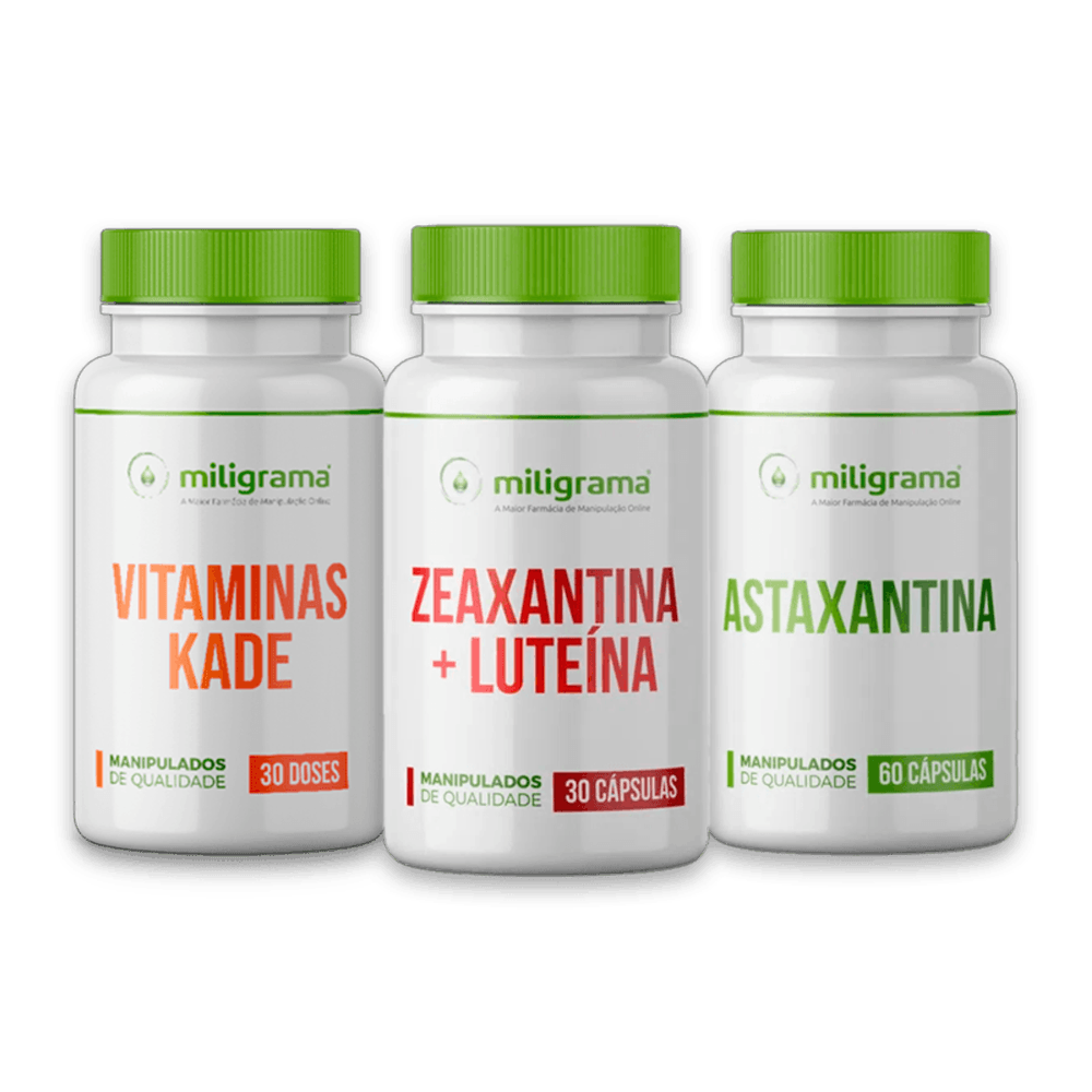 Benefícios: - Auxilia na melhora da visão; - Ajuda a diminuir a sensação de cansaço ocular; - Auxilia na melhora da visão noturna; - Promove uma proteção contra doenças degenerativas, como a catarata; - Ajuda a reduzir a sensibilidade à luz solar; Dicas para potencializar a suplementação: - Sempre que puder utilize óculos de sol, principalmente em dias com alta exposição solar, pois a radiação UV é um fator que pode causar danos à córnea. - Procure fazer o acompanhamento oftálmico anualmente, para acompanhar a necessidade do uso de óculos e atualizar sempre o grau de proteção adequado; - Procure incluir mais alimentos ricos em carotenos, como cenoura, mamão, tomate, laranja, melancia, tangerina, entre outros. Os carotenóides são os principais protetores da visão. - Cuide da higiene dos olhos. É muito importante lavar as mãos antes de tocá-los e sempre retirar a maquiagem antes de dormir para que não entrem partículas e sujidades, evitando assim contaminação com microorganismos. - Evite coçar os olhos. Esse simples ato pode causar sérias agressões e ao longo do tempo pode levar ao desenvolvimento do ceratocone, que é uma deformidade da córnea. O que é? Você já se imaginou como seria a vida se não pudéssemos enxergar? Não ver as cores do céu, as pessoas, as paisagens e todas as coisas que nos dão prazer? É por isso que devemos cuidar muito bem da nossa visão, pois ao longo da vida, conforme envelhecemos, as chances de desenvolvermos algum distúrbio da visão aumentam em até 30%. Devemos sempre lembrar que os olhos estão a todo momento expostos a vários agentes agressores e por isso todo cuidado é essencial para manter a saúde da visão. Além disso, a nossa alimentação contribui muito para a ingestão de nutrientes que fortalecem a nossa retina e protegem contra os danos causados pela radiação UV. No entanto, você pode cuidar ainda mais da sua visão com suplementos desenvolvidos especialmente para essa finalidade e que vão promover o fortalecimento das defesas imunológicas contra agentes que possam causar doenças e infecções nos olhos e comprometer a sua visão. Como agem os produtos? A zeaxantina e luteína são dois tipos de carotenos e funcionam como um protetor ocular absorvendo até 90% da luz azul danosa e atuando contra os radicais livres. Ambas não são produzidas pelo organismo e necessitam ser ingeridas na alimentação.Além disso, oferecem proteção extra contra o fotoenvelhecimento da pele. As Vitaminas KADE são compostas por vitamina K, vitamina A, vitamina D e vitamina E. São as vitaminas lipossolúveis que atuam principalmente como antioxidantes e protetoras contra doenças degenerativas, incluindo as que afetam a visão. A vitamina A também é muito importante na manutenção da visão noturna, formando os pigmentos que tornam possível enxergar mesmo em ambientes mais escuros. Além de tudo isso, essas vitaminas combinadas promovem um fortalecimento das defesas imunológicas, protegendo o organismo de ataques de vírus e bactérias. Já a astaxantina é outro carotenóide com uma eficácia de até 500 vezes maior que o betacaroteno. Possui ação antioxidante, de proteção dos olhos, melhorando a sensação de “vista cansada”, diminui a sensibilidade à luz solar e protege contra doenças degenerativas oculares relacionadas à idade, como a catarata. Composição: Zeaxantina e Luteína 30 doses + Vitaminas KADE 30 doses + Astaxantina 30 doses Modo de usar: Zeaxantina e Luteína = Tomar 1 cápsula uma vez ao dia Vitaminas KADE = Tomar 1 cápsula junto com o café da manhã Astaxantina = Tomar 1 cápsula uma vez ao dia Advertências: 1. Nunca compre medicamento sem orientação de um profissional habilitado. 2. Imagens meramente ilustrativas. 3. Pessoas com sensibilidade à substância não devem ingerir o produto. 4. Em caso de hipersensibilidade ao produto, recomenda- se descontinuar o uso e consultar o médico. 5. Não use o medicamento com o prazo de validade vencido. 6. Manter em temperatura ambiente (15 a 30ºC). Proteger da luz, do calor e da umidade. Nestas condições, o medicamento se manterá próprio para o consumo, respeitando o prazo de validade indicado na embalagem. 7. Todo medicamento deve ser mantido fora do alcance das crianças. 8. Este medicamento não deve ser utilizado por mulheres grávidas ou lactantes sem orientação médica. 9. Este medicamento não deve ser utilizado por menores de 18 anos sem orientação médica. 10. Este medicamento não deve ser partido ou mastigado. 11. Siga corretamente o modo de usar. Não desaparecendo os sintomas, procure orientação médica. 12. Os resultados e indicações referentes ao uso desse produto foram avaliados e comprovados pelos fabricantes dos insumo farmacêuticos e por estudos que comprovam as ações dos mesmos, conforme descrito nas referências bibliográficas. Não garantimos os resultados descritos, estes variam de pessoa para pessoa dependendo de diversos fatores como alimentação, prática de exercícios físicos, presença de outras patologias, bem como, o uso correto do produto conforme descrito na posologia. 13. "SE PERSISTIREM OS SINTOMAS, O MÉDICO DEVERÁ SER CONSULTADO" 14. Venda sob prescrição de profissional habilitado, podendo este ser o nosso farmacêutico de acordo com a Resolução 586/2013 do Conselho de Farmácia. Consulte-o! Referências: 1. Literatura do fornecedor;