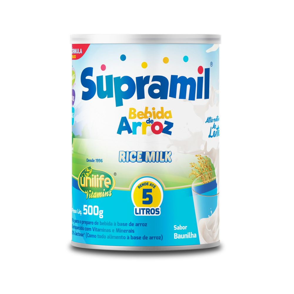SUPRAMIL BEBIDA DE ARROZ KIDS UNILIFE 500GDescrição: Suplemento alimentar vegano à base de arroz, enriquecido com minerais e vitaminas. Produto em pó, pronto para preparo com água.Modo de preparo: Adicione 20 g (1 colher dosadora - scoop) em 200 ml de água e mexa bem.Armazenamento: Conservar em temperatura ambiente entre 15°C e 30°C, em local seco e fresco, protegido da luz e umidade. Após aberto, manter a embalagem bem fechada e consumir em até 55 dias. Não utilizar produto com embalagem violada ou fora do prazo de validade.Ingredientes: Arroz, maltodextrina, polidextrose, mix de minerais (fosfato de cálcio dibásico, pirofosfato férrico, sulfato de magnésio monoidratado, sulfato de zinco monoidratado, sulfato de manganês, sulfato cúprico, picolinato de cromo, molibdato de sódio diidratado, selenito de sódio, iodeto de potássio), carbonato de cálcio, fosfato tricálcico, mix de vitaminas (acetato de retinol, cloridrato de tiamina, riboflavina, niacinamida, D-pantotenato de cálcio, cloridrato de piridoxina, D-biotina, ácido fólico, cianocobalamina, ácido ascórbico, acetato de DL-alfa-tocoferol), pó de cogumelo Agaricus bisporus com vitamina D2 tratado com radiação UV, aroma natural de baunilha, edulcorantes (sucralose, glicosídeos de esteviol, taumatina) e espessante carboximetilcelulose.Autorização: Produto autorizado para comercialização em todo o território nacional através da RDC 719/2022 da ANVISA. AFE do MS 6.02234-1.Informações adicionais: Não contém glúten. Livre de lactose.