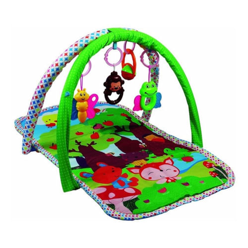 Fácil de montar e de limpar, o Tapete ginásio é confeccionado em tecido macio e possui brinquedos com chocalhos e mordedores.