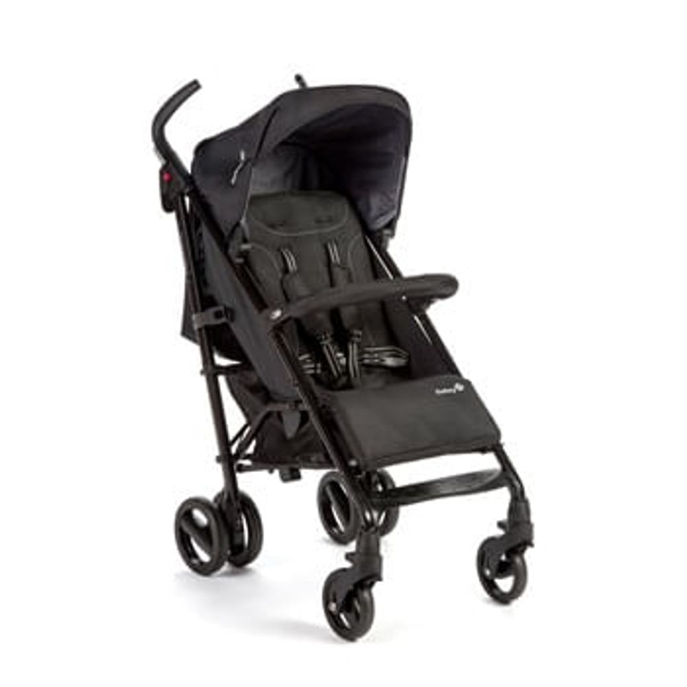 Capota retrátil e removível, com quebra-sol, visor e bolso para os pais. Cinto de segurança de 5 pontos com ajuste de altura e protetores acolchoados. Amplo cesto de compras, rodas traseiras maiores com sistema de freio centralizado e dianteiras com travas de movimento e amortecedores.