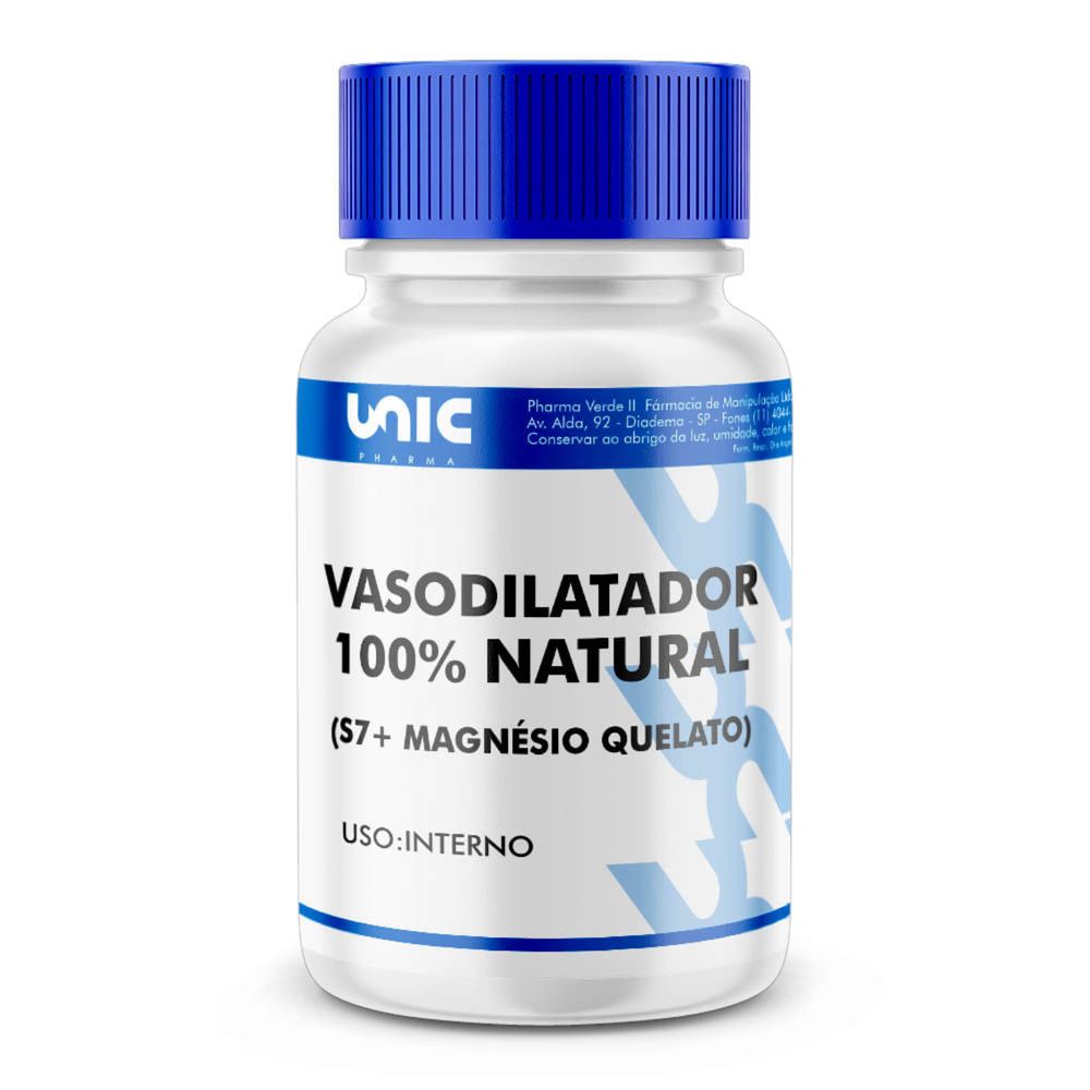 Vasodilatador 100% NaturalS7 com Magnésio QuelatoO s7® é uma combinação patenteada de sete ingredientes, plant-based, com ação clinicamente comprovada no aumento de 230% nos níveis de óxido nítrico (NO).O s7™ é uma combinação patenteada, plant-based de café verde, chá verde, cúrcuma, cereja, mirtilo, brócolis e couve. A formulação é rica em fitoquímicos e compostos bioativos capaz de influenciar a sinalização redox e a atividade metabólica celular. Os resultados obtidos após a ingestão de s7™ sugerem o uso potencial do suplemento na correção da sinalização redox desequilibrada inerente a distúrbios metabólicos que são acompanhados por baixa biodisponibilidade de NO, resposta inflamatória elevada e níveis de glicose no sangue.O s7™ pode ser considerado uma alternativa natural para a recuperação esportiva, desempenho esportivo, saúde cardiovascular, saúde metabólica, vitalidade e longevidade.O s7® é capaz de influenciar a sinalização redox e a atividade metabólica celular. Os resultados obtidos após a ingestão de s7® sugerem o uso potencial do suplemento na correção da sinalização redox desequilibrada inerente a distúrbios metabólicos que são acompanhados por baixa biodisponibilidade de NO, resposta inflamatória elevada e níveis de glicose no sangue. O s7® pode ser considerado uma alternativa natural para a recuperação esportiva, desempenho esportivo, saúde cardiovascular, saúde metabólica, vitalidade e longevidade.Os efeitos multifacetados observados desta nova formulação promovem equilíbrio redox saudável por modulação de:- Um fluxo saudável e adequadamente modulado de radicais livres e oxidantes.- Um nível apropriado de antioxidantes juntamente com sistemas totalmente funcionais para reciclar esses antioxidantes.- Suporte nutricional robusto que ajuda a manter os níveis ideais de antioxidantes e cofatores de suporte.- Sistemas enzimáticos em pleno funcionamento que reparam ou reciclam e substituem materiais celulares danificados, por exemplo, DNA, RNA, enzimas, proteínas e moléculas redox endógenas (glutationa, vitamina C, vitamina E).Magnésio QuelatoO Magnésio Quelato (Bisglicinato) possui ligação com duas moléculas de glicina (aminoácido), o que potencializa seus benefícios proporcionando uma maior absorção e aproveitamento do magnésio pelo organismo. O magnésio é importante no processo de metabolização do Cálcio, da Vitamina C, Fósforo, Sódio e Potássio, sendo muito utilizado como suplemento por pessoas que não conseguem suprir suas necessidades diárias desse composto através da ingestão alimentar. Participa do processo de fixação do cálcio nos ossos, contribuindo para o fortalecimento ósseo. Além disso, promove efeito analgésico natural, auxiliando na redução da dor, recuperação muscular e melhora do desempenho durante a atividade física. O magnésio é vital para saúde do tecido muscular e nervosoPosologiaTomar 1 cápsula ao dia.** Ou conforme orientações de um profissional.BenefíciosBooster de óxido nítrico;Melhora da performance em praticantes de atividade física;Saúde cardiovascular;Imunidade;Saúde sexual;Diabetes;Longevidade.Composição sugeridaCada dose contém 50mgPara que serve o s7 Vasodilatador 100% Natural?O s7™ pode ser considerado uma alternativa natural para a recuperação esportiva, desempenho esportivo, saúde cardiovascular, saúde metabólica, vitalidade e longevidade. Quais são os benefícios do Vasodilatador 100% natural?O s7® é capaz de influenciar a sinalização redox e a atividade metabólica celular. Os resultados obtidos após a ingestão de s7® sugerem o uso potencial do suplemento na correção da sinalização redox desequilibrada inerente a distúrbios metabólicos que são acompanhados por baixa biodisponibilidade de NO, resposta inflamatória elevada e níveis de glicose no sangue. O s7® pode ser considerado uma alternativa natural para a recuperação esportiva, desempenho esportivo, saúde cardiovascular, saúde metabólica, vitalidade e longevidade. Quais são os benefícios do Vasodilatador 100% natural?Booster de óxido nítrico;Melhora da performance em praticantes de atividade física; Saúde cardiovascular; Imunidade; Saúde sexual; Diabetes;Longevidade.Como tomar o Vasodilatador 100% natural?Tomar 1 cápsula ao dia ou conforme orientações de um profissional.O s7 Vasodilatador 100% natural funciona?Sim! O s7® é uma combinação patenteada de sete ingredientes, plant-based, com ação clinicamente comprovada no aumento de 230% nos níveis de óxido nítrico (NO). Onde comprar o s7 Vasodilatador 100% natural Só na Unicpharma você encontra o s7 Vasodilatador 100% natural com os melhores preços e as melhores condições.*Não se trata de propaganda, e sim de descrição do produto, consulte sempre um especialista. **Venda Sob prescrição de profissional habilitado, podendo este ser o nosso farmacêutico de acordo com a resolução 586/2013 do conselho de farmácia. Consulte-o. Sugestão de uso e benefícios desenvolvidos por profissional habilitado. Todo produto deste site possui dosagens dentro dos padrões usuais.Advertências* Estiver Grávida Ou Amamentando, Consulte Um Médico Antes De Usar Este Produto. * Mantenha Fora Do Alcance De Crianças. Guarde Em local frio e seco. * Não misturar esse medicamento com outro tipo de estimulante drogas ou bebida alcoólica. 1. Nunca compre medicamento sem orientação de um profissional habilitado. 2. Imagens meramente ilustrativas.s 3. É recomendável uma dieta e exercícios físicos para auxiliar a redução de "peso". 4. Pessoas com hipersensibilidade à substância não devem ingerir o produto. 5. Em caso de hipersensibilidade ao produto recomenda- se descontinuar o uso e consultar o médico. 6. Não use o medicamento com o prazo de validade vencido. 7. Manter em temperatura ambiente (15 a 30ºC). Proteger da luz do calor e da umidade. Nestas condições o med